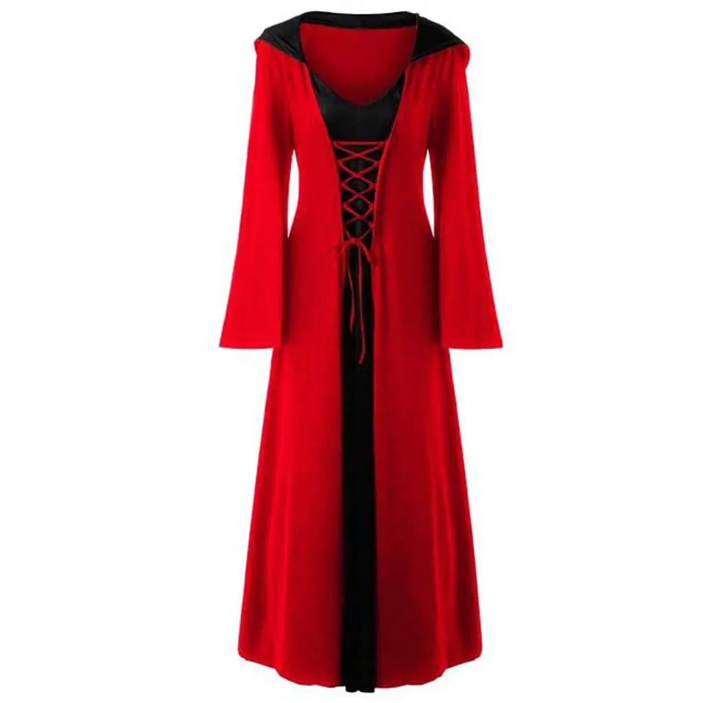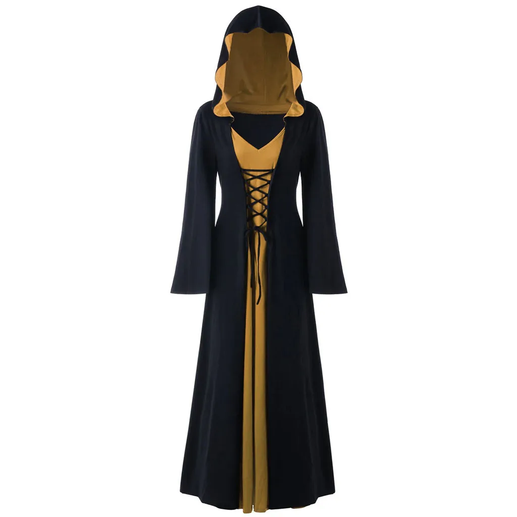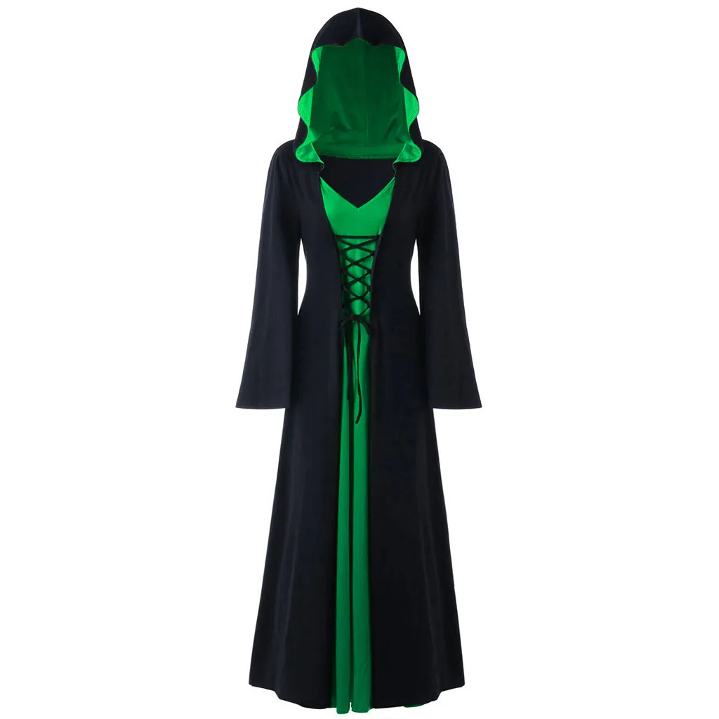 Женское длинное платье макси с капюшоном, шнуровкой и длинными рукавами, в стиле пэчворк, для Хэллоуина, размера плюс