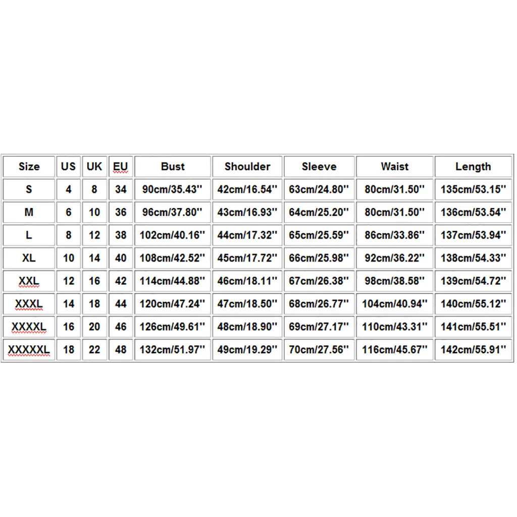 Что вы получаете: 1 женское платье Размеры Свяжитесь с нами Великобритания ЕС Обхват груди Сумка на плечо Рукава Обхват талии Длина S 4 8 34 90 см/35,43'' 42 см/16,54'' 63 см/24,80'' 80 см/31,50'' 135 см/53,15'' М 6 10 36 96 см/37,80'' 43 см для ухода за ребенком для мам/16,93'' Высота голенища 64 см; 25,20'' 80 см/31,50'' 136 см/53,54'' L 8 12 38 102 см/40,16'' 44 см/17,32'' 65 см/25,59'' 86 см/33,86'' 137 см/53,94'' XL 10 14 40 108 см/42,52'' 45 см/17,72'' 66 см/25,98'' 92 см/36,22'' 138 см/54,33'' XXL 12 16 42 114 см/44,88'' 46 см/18,11'' 67 см/26,38'' 98 см/38,58'' 139 см/54,72'' XХХL 14 18 44 120 см/47,24'' 47 см/18,50'' 68 см/26,77'' 104 см/40,94'' 140 см/55,12'' XXXXL 16 20 46 126 см/49,61'' 48 см/18,90'' 69 см/27,17'' 110 см/43,31'' 141 см/55,51'' XXXXXL 18 22 48 132 см/51,97'' 49 см/19,29'' 70 см/27,56'' 116 см/45,67'' 142 см/55,91''