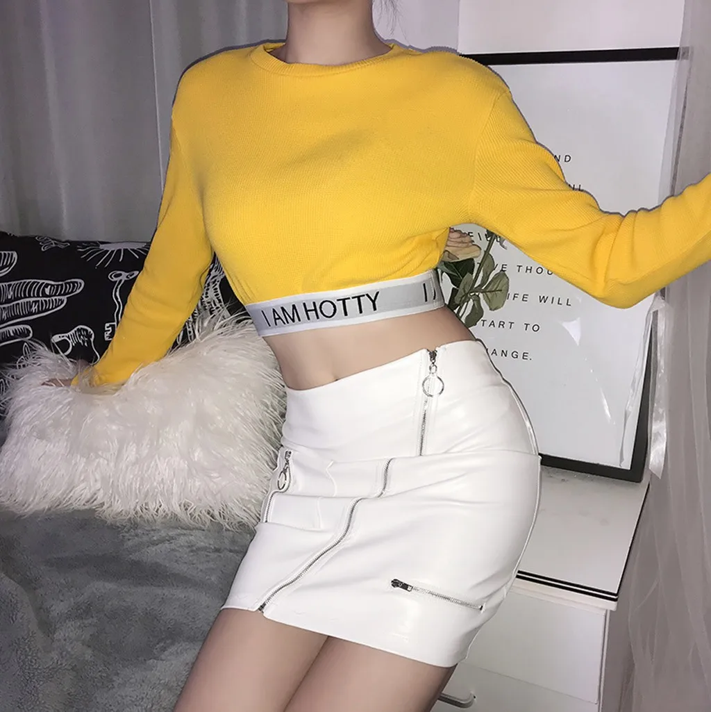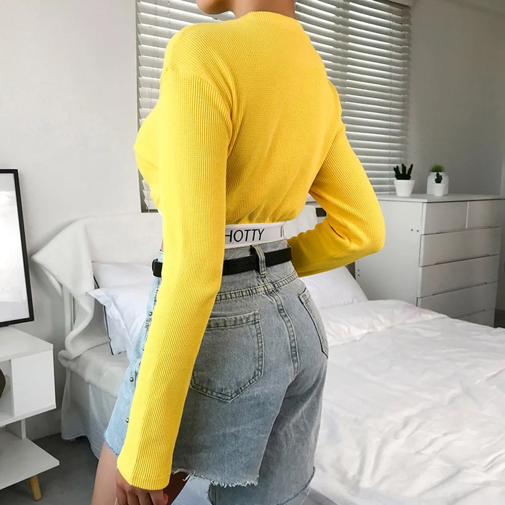 Thin Knitted Crop Sweater For Women Yellow Color Letter Print O-neck Short Jumper Autumn Winter Sweaters Streetwear