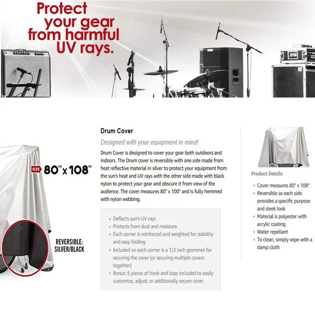 1、Durable multi-functional design: Cover measures 80 x 100inch and is fully hemmed with nylon webbing. Weighted corners provide a strong base each containing a 1/2inch grommet for securing multiple covers together or to make a temporary curtain to hang on stage. 2、Portable reversible design: Provides a specific purpose and sleek look to each side. Easily fold cover compact enough to take with you on the road; perfect for any drummer! Bonus: 6 pieces of hook and loop included to customize and adjust as needed. 3、Deflect suns heat: As the silver side of this cover is made of reflective material designed to keep your drums cool and safe from the heat's damaging UV rays when on stage outdoors. To clean, simply wipe with a damp cloth. 4、Protect from dust and dirt: As the black side of this drum set dust cover is made with nylon keeping your instruments protected from dust, dirt and moisture while also covering drummers equipment inconspicuously when up on stage. 5、Satisfaction guaranteed: Our durable material makes this a long lasting product that will help protect your equipment from the elements. If however you aren’t satisfied with it we offer a 100% Money Back Guarantee through amazon's return policies.1x drum set dust cover