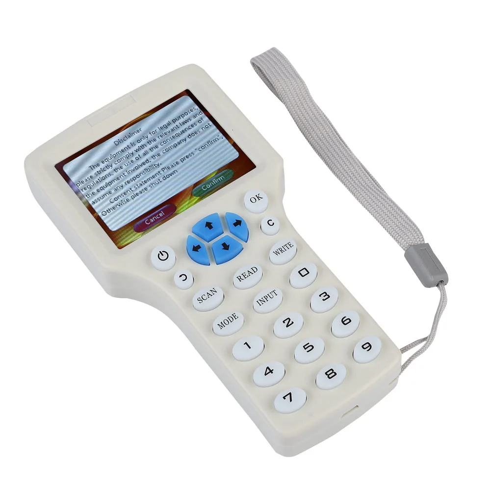 HD 3,2 дюймовый полноцветный светодиодный экран с четким изображением дисплей эффект. ID/IC полная рука, голосовая передача. Можно воспроизвести эти частоты ID-карты: 125 кГц, 250 кГц, 500 кГц, 375 кГц, 750 кГц, 875 кГц, 1000 кГц. IC карта: 13,56 МГц. HID карты. Входной номер цифрового ключа может быть непосредственно введен. Питание от 4 батареек AAA (не входят в комплект), легко носить с собой. Также может питаться от USB кабеля. Поставляется декодирование, непосредственно компилирование различных типов смарт-карт для контроля доступа. Он может взломать зашифрованные карты. Оригинальная карта для чтения и копирования для письма.