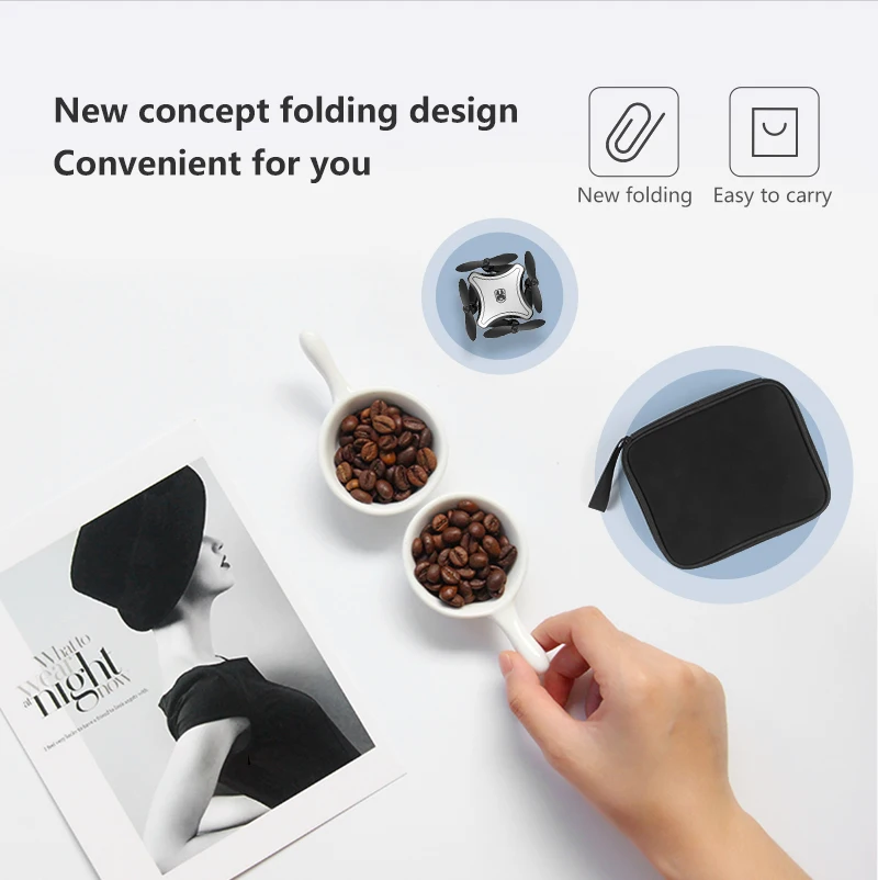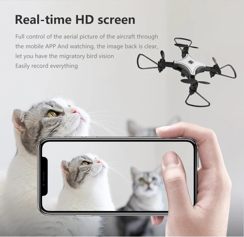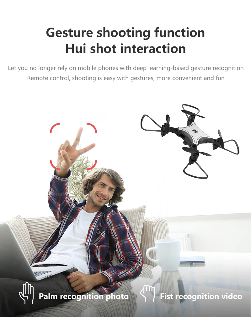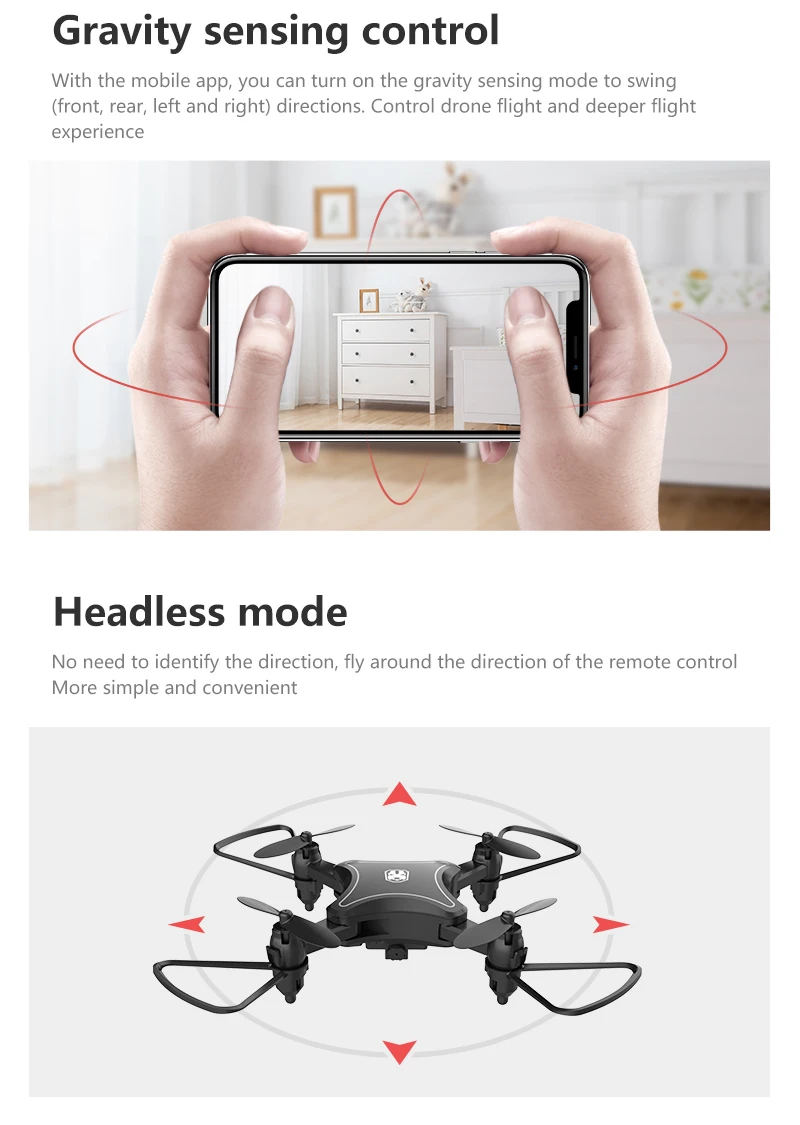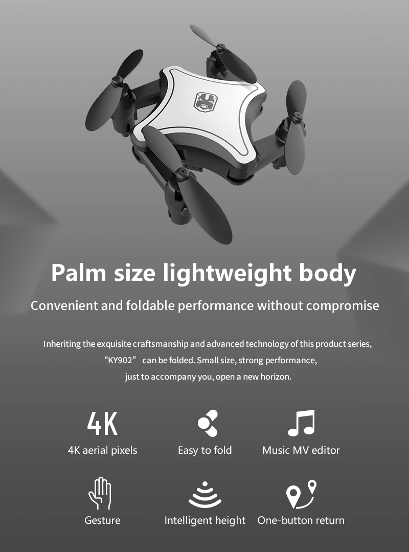 --------------------Product Description------------- Product Features: 1, folding storage 2, 4k camera and 720P camera 3, MV production 4, fixed height hover 5, 15 minutes flight time 6, intelligent fixed height 7, one key return 8, gravity sensing control 9, no head mode 10, voice control 11, one button take off and land 12, trajectory pointing flight 13, speed control 14, with 4 LED lights 15, 3D roll 16. Gesture shooting photo / boxer recognition video screen 17, 2.4G remote control frequency 18, one button emergency stop Product specifications: Main material: ABS + electronic components Color: white and black Remote control frequency: 2.4G Channel: 4 channels Drone battery: 3.7V-300mA/H lithium ion rechargeable battery Flight time: about 15 minutes or so Charging time: about 90 minutes Remote control battery: AAA*4-6V alkaline battery (not included) Remote control distance: 100 meters Flying height: 100 meters Drone size: 6*6*3cm folding /14*14*3cm expansion (length * width * height) Storage box size: 20*5*17cm (length * width * height) Package weight: about 300 grams packing list: MINI aircraft*1 Remote control*1 Propeller fan blade *4 Protection frame*4 Mobile phone holder*1 USB charging cable*1