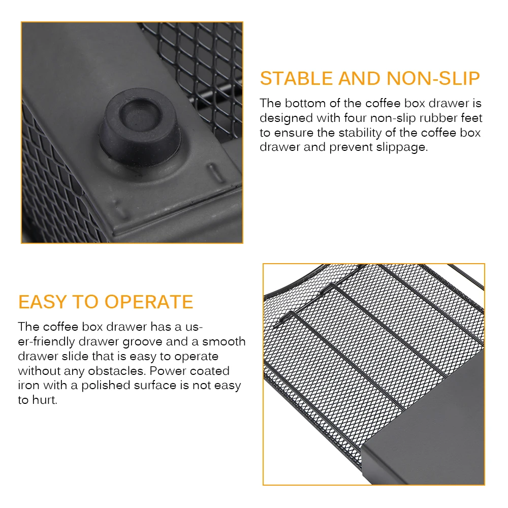 Кронштейн для кофейных капсул изготовлен из высококачественного железного материала и покрыт хромом. Гладкая черная поверхность обладает хорошей антикоррозийной способностью, которая идеально подходит для кухни.