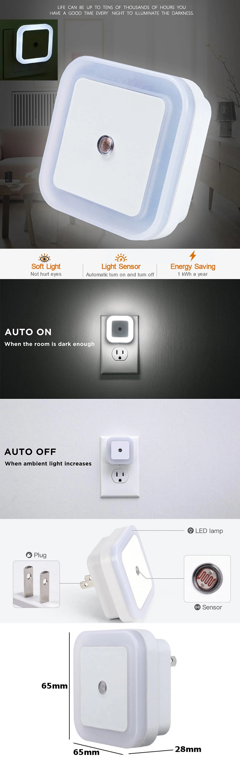 1. Мягкое свечение, Автоматическое включение/выключение, энергоэффективность, компактный размер, вилки ЕС и США