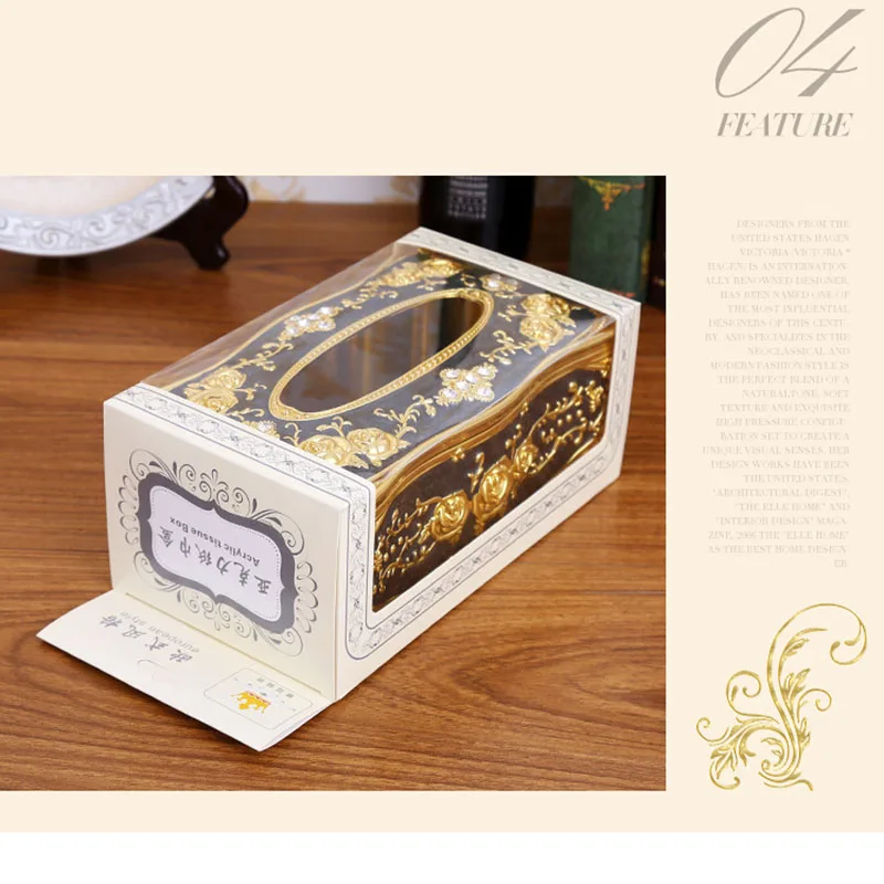 1. Изготовлено из акрилового материала, вакуумное металлизирование. 2. Легко извлекать ткань из отверстия, многоразовые. 3. С элегантным и роскошным внешним видом. 4. Подходит для хранения или украшения дома, кафе, отеля, ретранслятора или автомобиля.