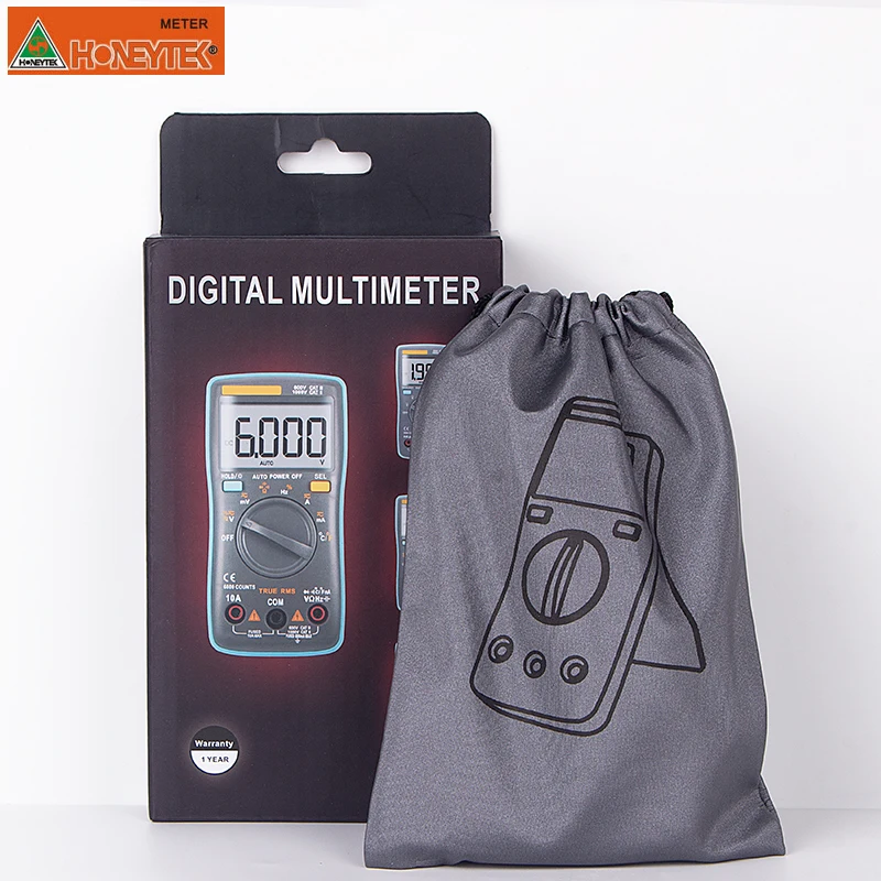Модель KP102 ТЕХНИЧЕСКИЕ ХАРАКТЕРИСТИКИ Диапазон Best Accurary Напряжение постоянного тока (в) 60 мВ ~ 1000 В ±(0.5% + 3) Напряжение переменного тока (в) 60 мВ ~ 750 В ±(1.0% + 3) Постоянный ток (A) 60ма ~ 10А ±(1.2% + 3) Переменный ток (A) 60ма ~ 10А ±(1.5% + 3) Сопротивление (Ω) 600Ω ~ 60MΩ ±(0.5% + 3) Конденсатор (F) 10nF ~ 10mF ±(2.0% + 5) Частота (Гц) 100 Гц ~ 10 МГц ±(0.1% + 2) Температура (℃) -20 ~ 1000 ℃ ±(2.5% + 5) Температура (℉) -4 ~ 1832 ℃ ±(2.5% + 5) Особенности: Дисплей отсчет: 6000 Автоматически настраивающийся диапазон Рабочий цикл Цифровой мультиметр, измеряющий истинные Измерение диода Авто Мощность Off Continutity зуммер Удержания данных ЖК-дисплей Подсветка Низкая Батарея индикация Общие характеристики Мощность: 1,5 в ААА * 2 Цвет изделия: синий и серый Вес нетто продукта: 120 г Размер изделия: 130*65*32 мм Стандартные аксессуары: батарея (не входит в комплект), тестовый провод, датчик температуры Стандартная Индивидуальная Упаковка: Подарочная коробка, картонная коробка, руководство