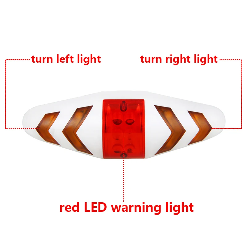 5. Средняя кнопка пульта дистанционного управления может управлять красным светодиодный предупреждающий светильник хвостовой светильник, а левая и правая кнопки соответственно контролируют желтый светодиодный светильник направления на задний светильник.