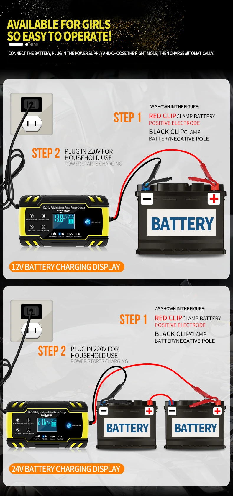 • 3 зарядные устройства подходят для большинства типов аккумуляторов, включая кальций, гель и AGM, мокрый батарей. Они также могут помочь восстановить сливные и сульфированные батареи.