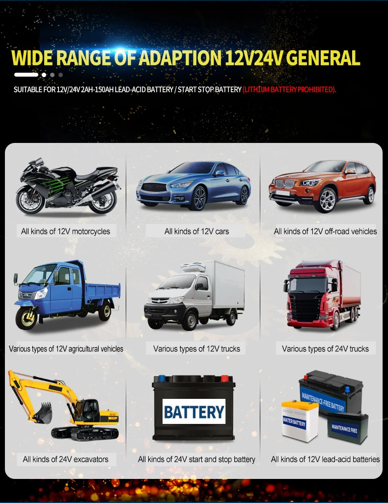 • Типы батарей: большинство типов свинцово-кислотных батарей, включая кальций, гель и AGM, влажные, EFB и т. Д.