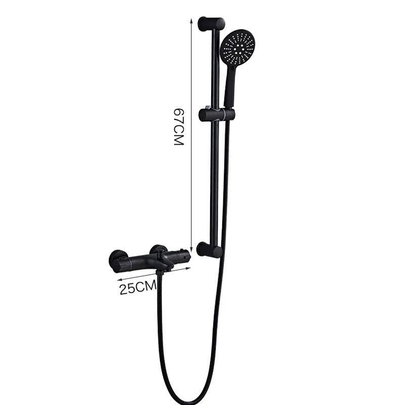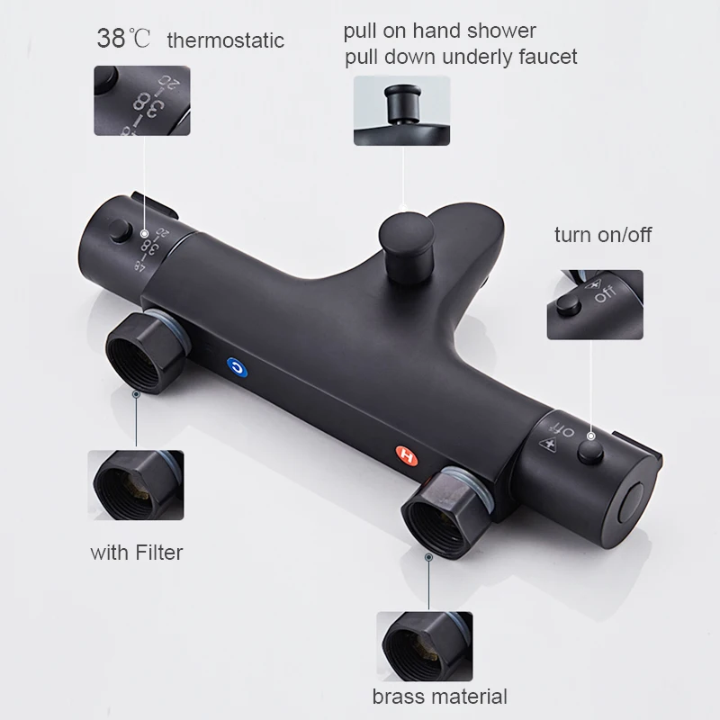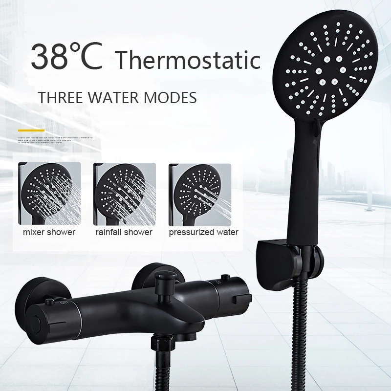 Функция нагревания: термостатический набор для душа Высококачественная отделка: черный/хром Рекомендуемое количество ручек: одна ручка Отверстия для установки в розетку: одно отверстие Тип регулируемого клапана: керамический Материал корпуса смесителя: латунь Водопроводный материал ручки смесителя: латунь