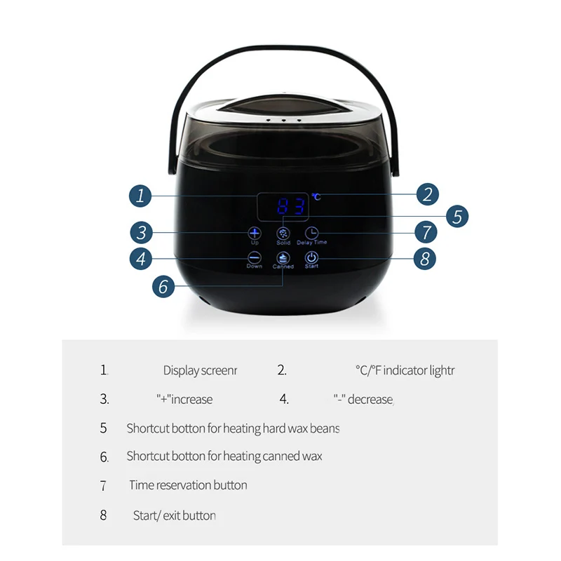 Простота в использовании: простой компактный дизайн, но практичный и мощный. Plug-n-play. Светодиодный дисплей для контроля температуры воска. А функция задержки времени позволяет использовать его непосредственно после купания, не дожидаясь.