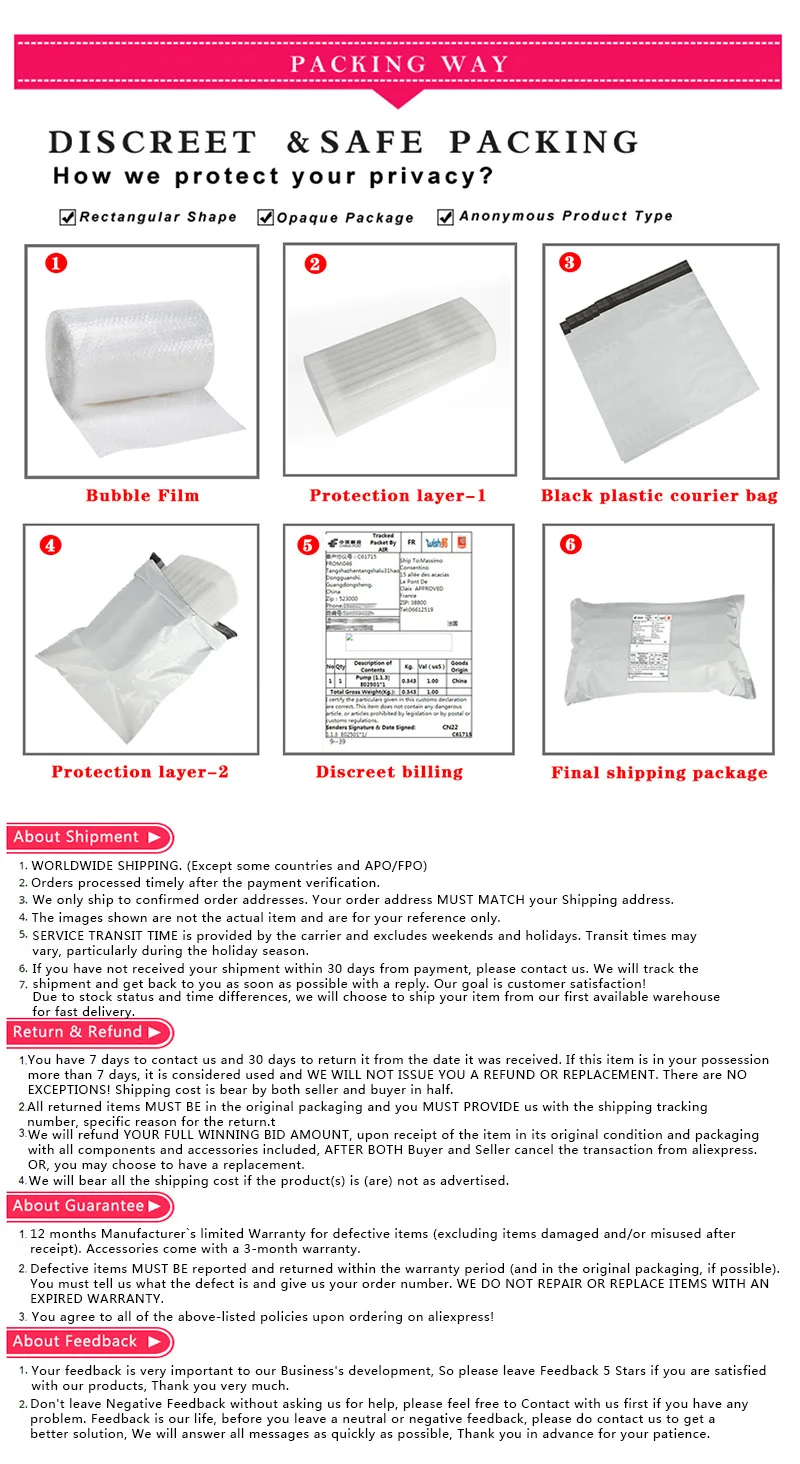 Особенности: Эффективный способ увеличения размера вашего пениса как в длине, так и в обхвате Это также может помочь мужчинам значительно повысить их сексуальную производительность. Примените ФИЗИОТЕРАПЕВТИЧЕСКИЙ вакуумный насос, безопасный и эффективный. Большинство мужчин удивлены увеличением размера своего пениса после тренировки. Все мужчины, которые хотят тренировать пенис. Высокое качество и безопасность АБС, ПВХ, силикон, мягкий, гладкий, нетоксичный и без запаха. Тип питания: USB зарядка, встроенный аккумулятор Материал: АБС + ПВХ + силикон Размер: как на картинке Инструкции по использованию: Убедитесь, что все детали надежно подключены. Нанесите немного смазки вокруг силиконового или термопластичного кольца, чтобы уменьшить трение. Аккуратно вставьте пенис, убедитесь, что уплотнение герметично прилегает к вашему пенису. Нажмите кнопку «+» один раз, чтобы включить насос, синий светильник будет мигать после включения. Нажмите кнопку «+» постепенно, чтобы увеличить давление. Если вы чувствуете какую-либо боль при высоком давлении, нажмите кнопку «-», чтобы уменьшить давление. Чтобы снять давление воздуха, нажмите кнопку «клапан». Конфиденциальности гарантировано: Ваша конфиденциальность очень важна для нас. По умолчанию в посылка входит «фонарик» (любые другие требования, пожалуйста, отправьте нам сообщение), и с нашей незаметной упаковкой вы можете делать покупки с уверенностью, единственный человек, который знает, что внутри посылка, это вы! Упаковка включает в себя: 1 x помпа для пениса 1 x силиконовый резиновый чехол 1 x кабель для зарядки
