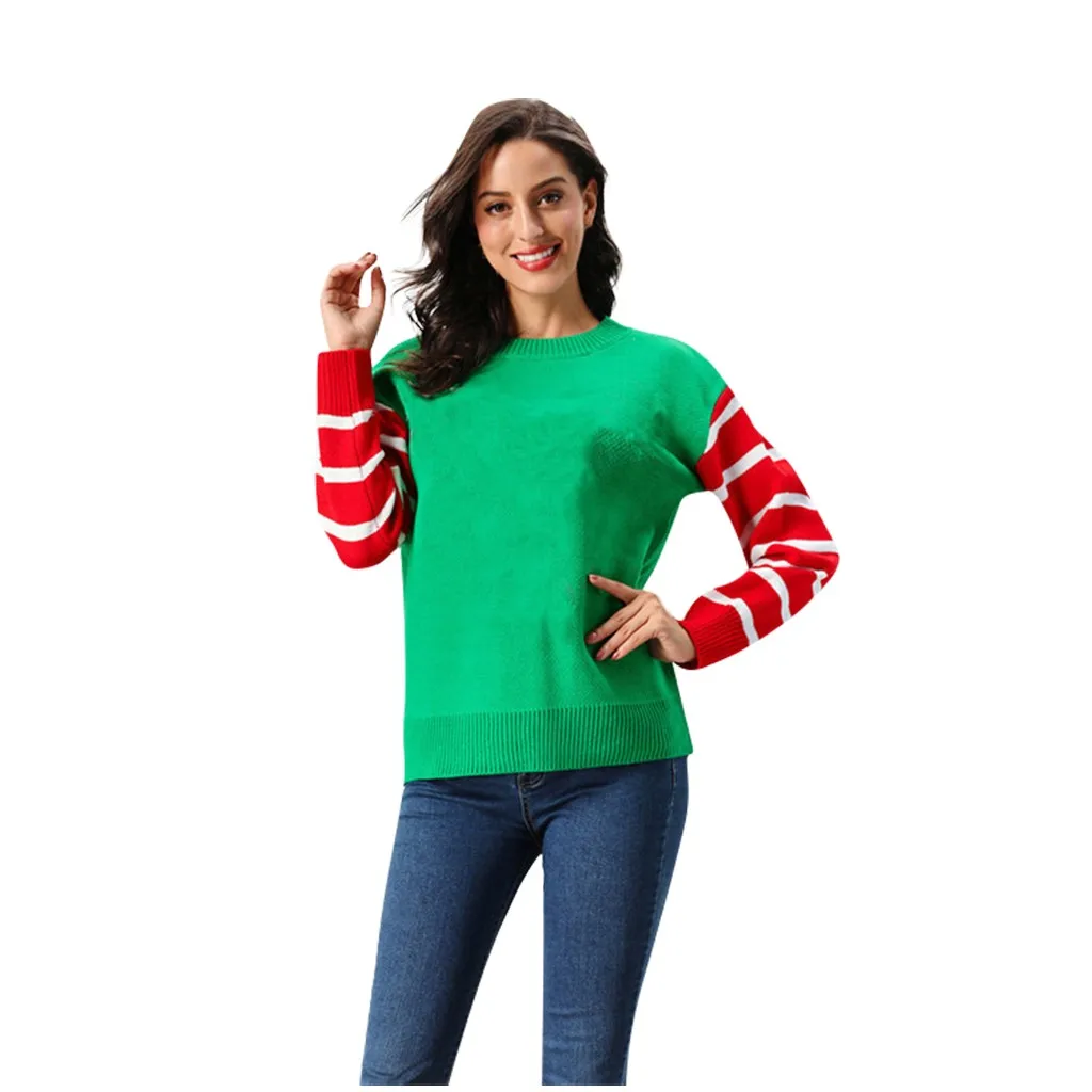 Женский Зимний Рождественский Красный Зеленый Полосатый пуловер с круглым вырезом и длинными рукавами