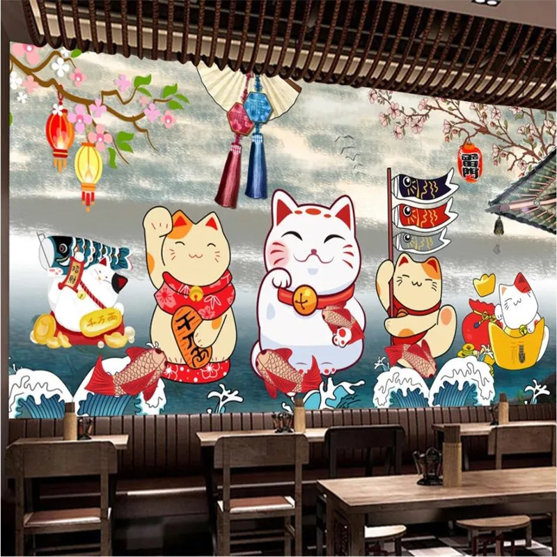 Пользовательские японские Lucky Cat Ukiyo-e кухня фон настенная бумага для суши Ramen Ресторан промышленный Декор настенная бумага 3D