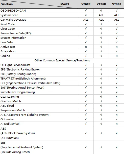 Специальные функции VT360 и VT600 одинаковые, VT360 поддерживает полное сканирование системы, VT600 не может. Пожалуйста, приобретайте в соответствии с фактическими потребностями.