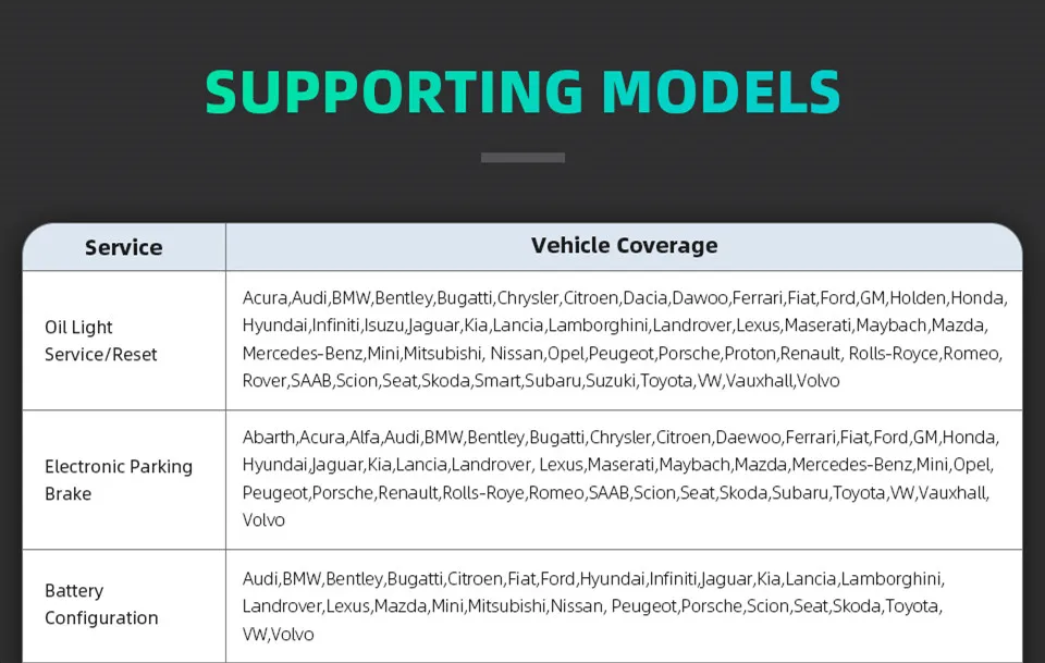 1. Масляный светильник/Сброс: для Acura, для Audi,forBMW, для Bentley, для Bugatti, для Chrysler, для Citroen, для Dacia, для Dawoo, для Ferrari, для Fiat, для Ford, для GM, для Holden, для Honda, для Hyundai, для Infiniti, для Isuzu, для Jaguar, для Kia, для Lancia, для Lamborghini, для Landrover, для Lexus, для Maserati, для Maybach, для Mazda, для Mercedes forBenz, для Mini, для Mitsubishi, для Nissan, для Opel, для Peugeot, для Porsche, для Proton, для Renault, Для Rolls-для Royce, для Romeo, для Rover, для SAAB, для Scion, для Seat, для Skoda, для Smart, для Subaru, для Suzuki, для Toyota, для VW, для Vauxhall, для Volvo.