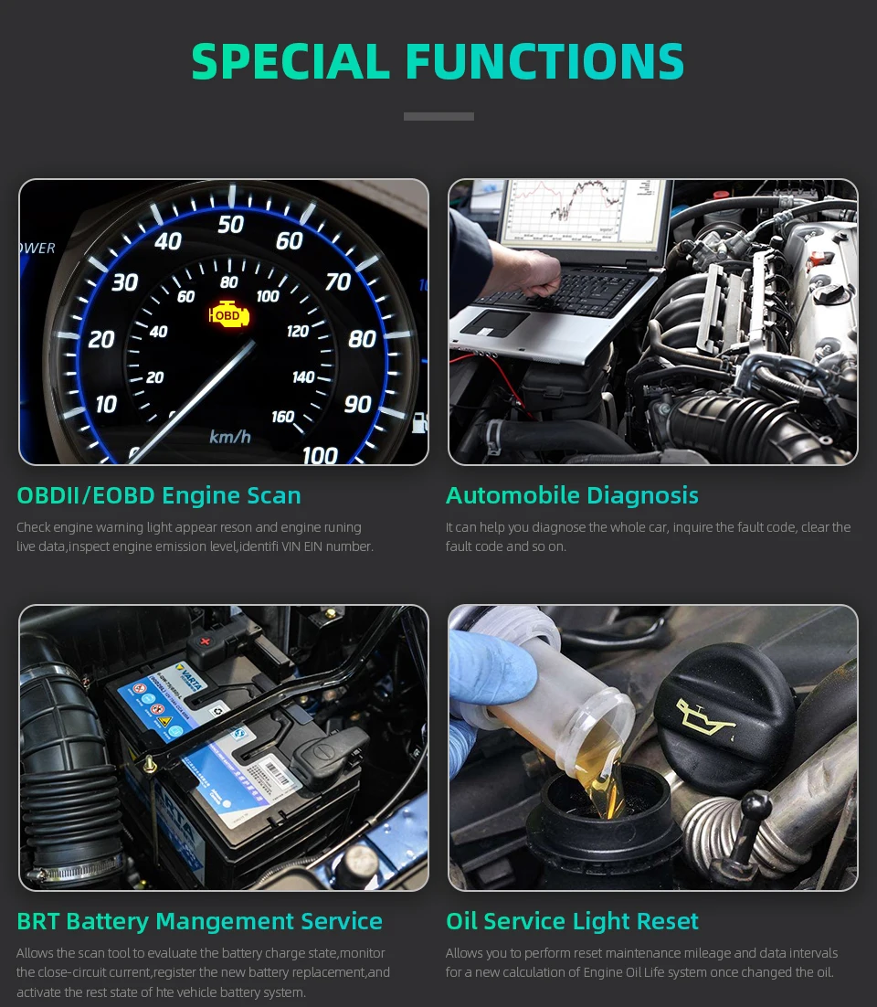 1. Мощные функции: поддержка полной системы OBD2 сканирования + сброса, включая сброс ABS, сброс SAS, сброс EPB, сброс масла, регенерация DPF, сброс TPMS, сброс TPS, обслуживание BRT, инжекторное кодирование, передача обучения, Immo и т. Д.:
