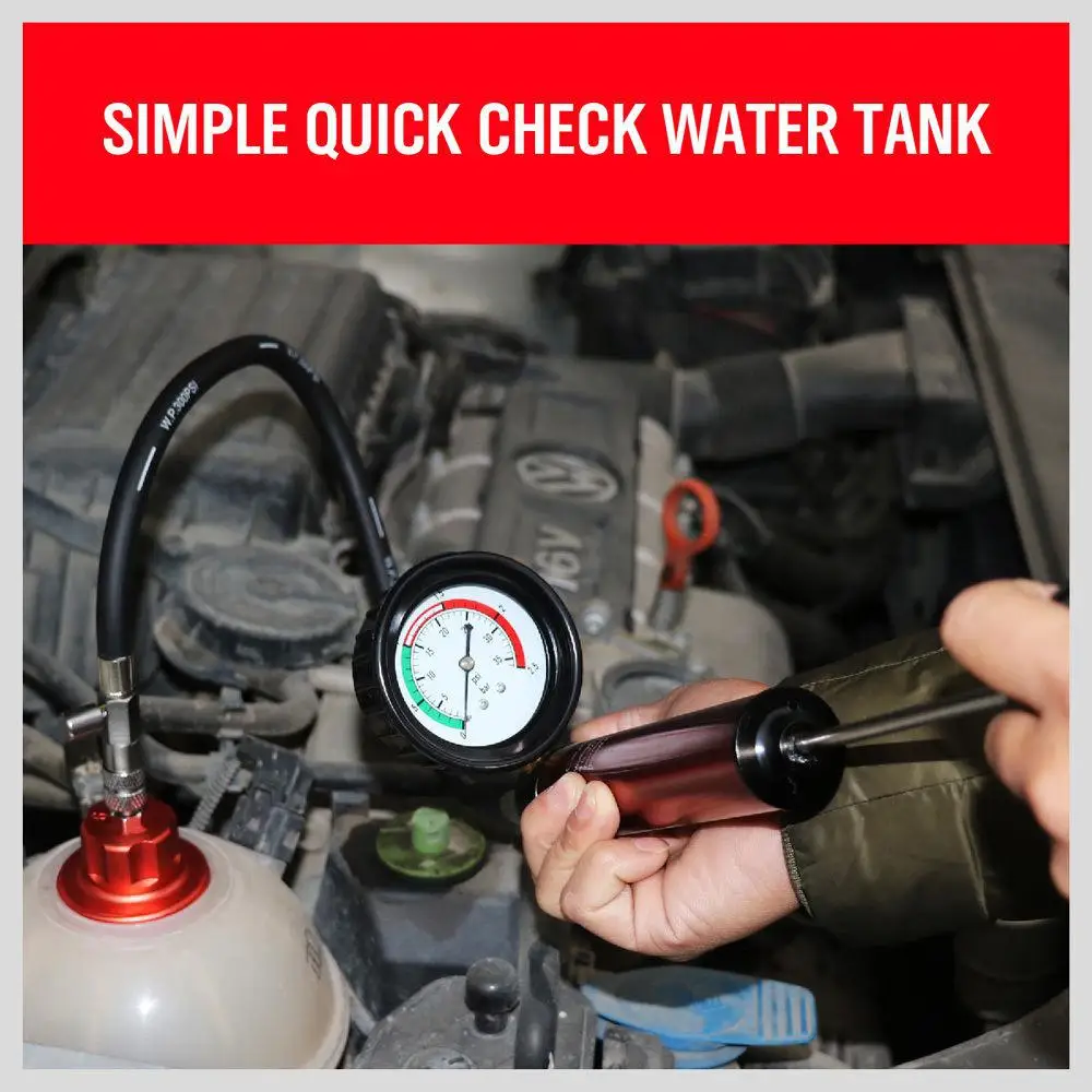 -- Алюминиевые колпачки для резервуара радиатора имеют цветовой код для удобства использования и имеют быстросъемные фитинги. -Сверхмощный испытательный комплект давления подходит для широкого спектра применения транспортного средства и для обнаружения утечек в системе охлаждения транспортного средства. -- Блок насоса имеет плавное действие и легкость шкала считывания. -- Идеальный инструмент для тестирования утечек, прокладки головки, радиатора, сердечника нагревателя и бака коллектора.