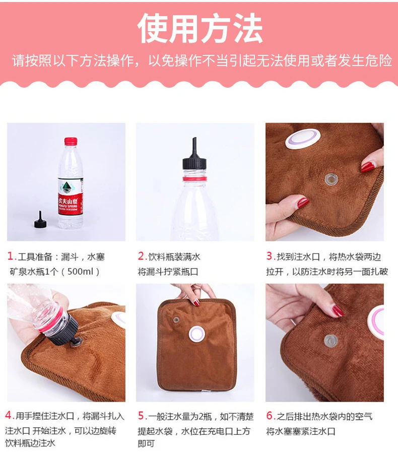 Особенности: Изготовлен из высококачественного ПВХ и хрустального бархата, прочный в использовании. Дизайн с милым мультяшным принтом. Отличная теплая производительность. Автоматический контроль температуры для предотвращения перегрева. Можно спрятать две руки, сохраняя тепло в течение очень долгого времени. Перезаряжаемый дизайн, удобный в использовании. Компактный и легкий, легко носить с собой. Применение: Пожалуйста, вытяните вилку для воды, и есть отверстие, которое вставляет воронку в отверстие, и добавьте в нее воду, добавьте 1100 мл. Пожалуйста, плотно Подключите вилку к воде. Сумка с подогревом воды до 70 градусов остановит нагрев, интеллектуальное отключение питания, безопасность и взрывозащищенность. Примечание: Продукт является пустым мешком, вам нужно налить воду 1100 мл в пакет. Технические характеристики: Тип товара: сумка для горячей воды Материал: Бархат с кристаллами, ПВХ Цвет: синий/розовый/красный/черный Вилка: вилка стандарта ЕС/США Напряжение: 220 В/50 Гц Мощность: 420w Время использования: 2- 8 часов Время зарядки: 8-12 минут Емкость воды: 1100 мл Размер изделия: 26*20 см/10,23*7,87 дюйма (Д * Ш) Посылка в комплект входит: 1 х сумка для горячей воды