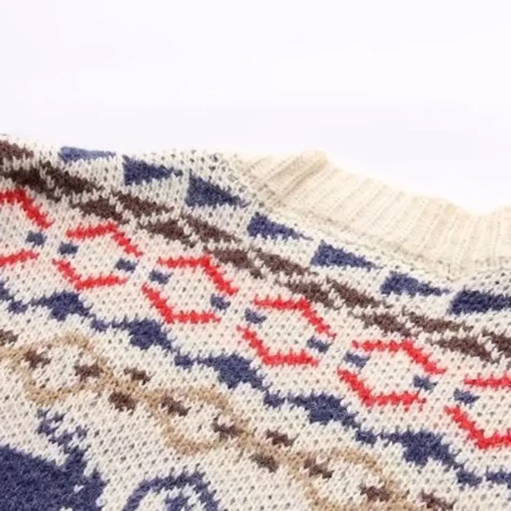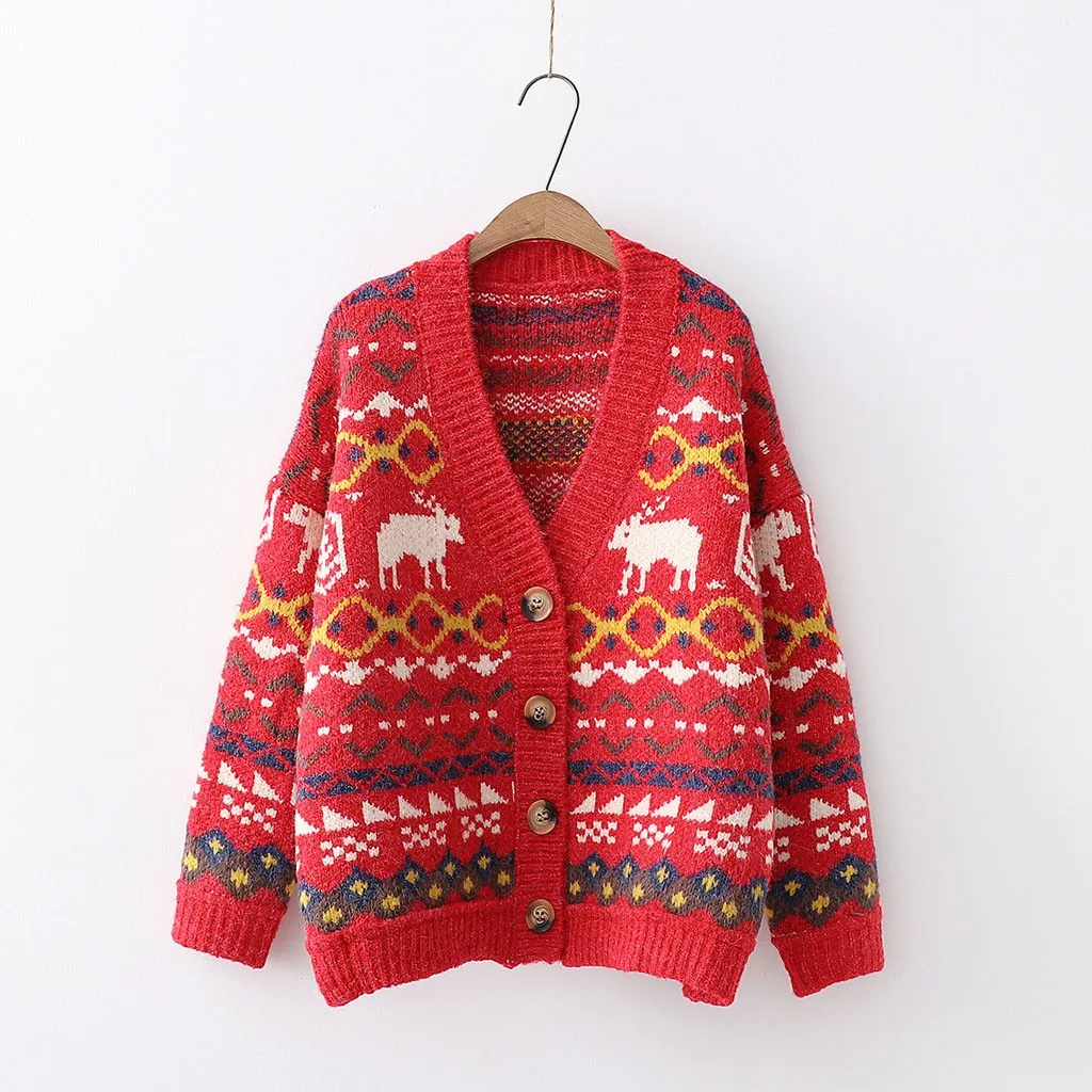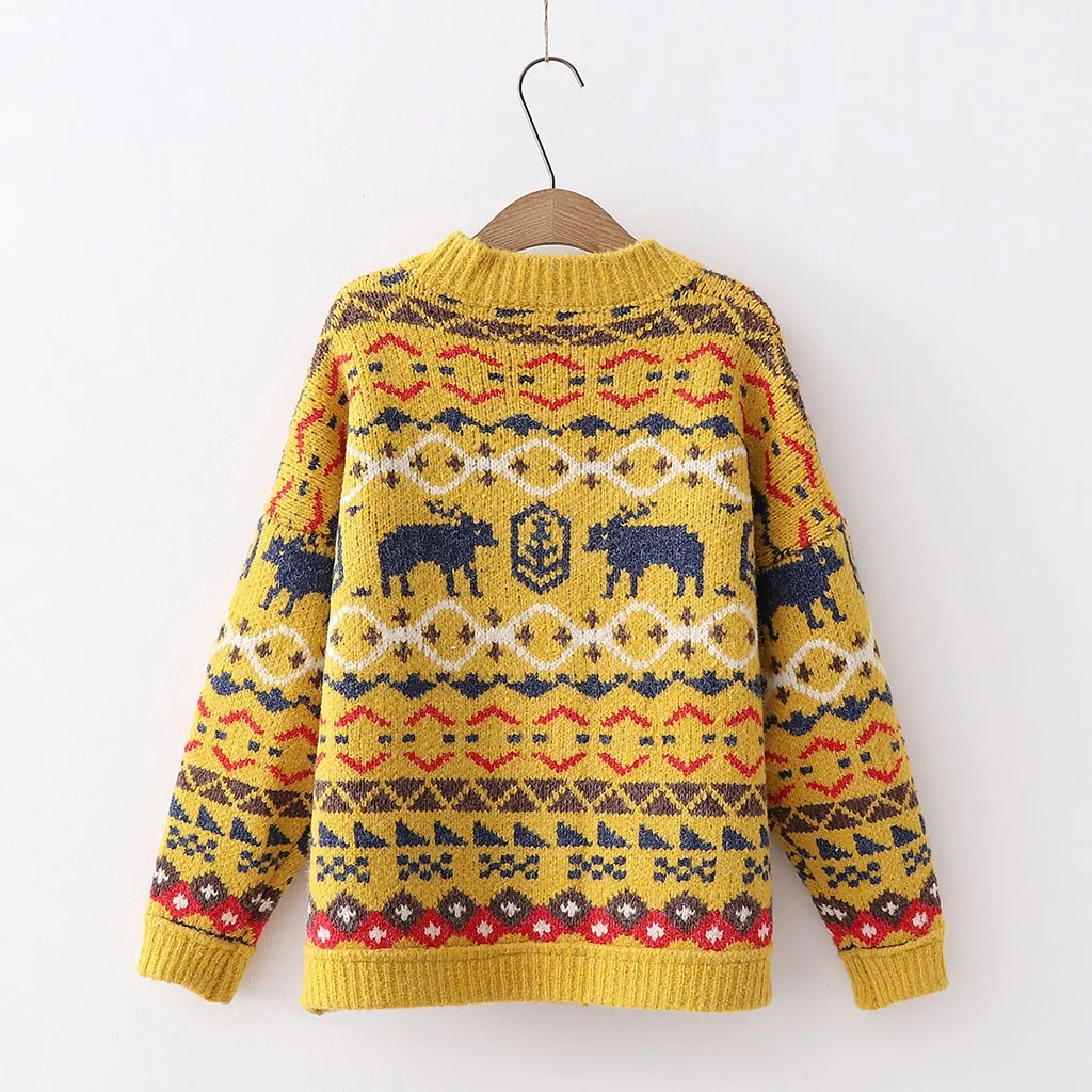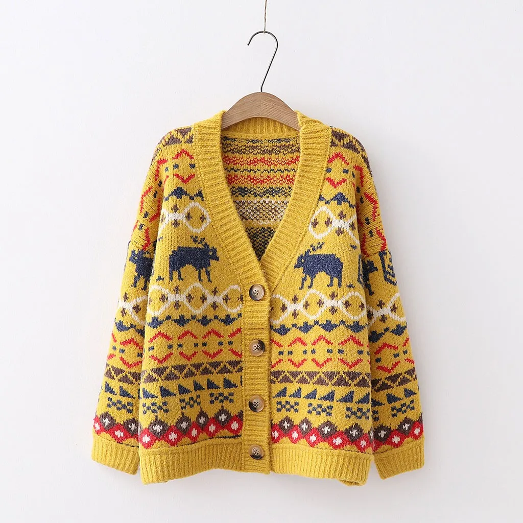 Модные женскиеЖенский кардиган, Женское пальто, этнический узор, v-образный вырез, однобортный, длинный рукав, вязаный свитер, бежевый, красный, желтый, трикотаж