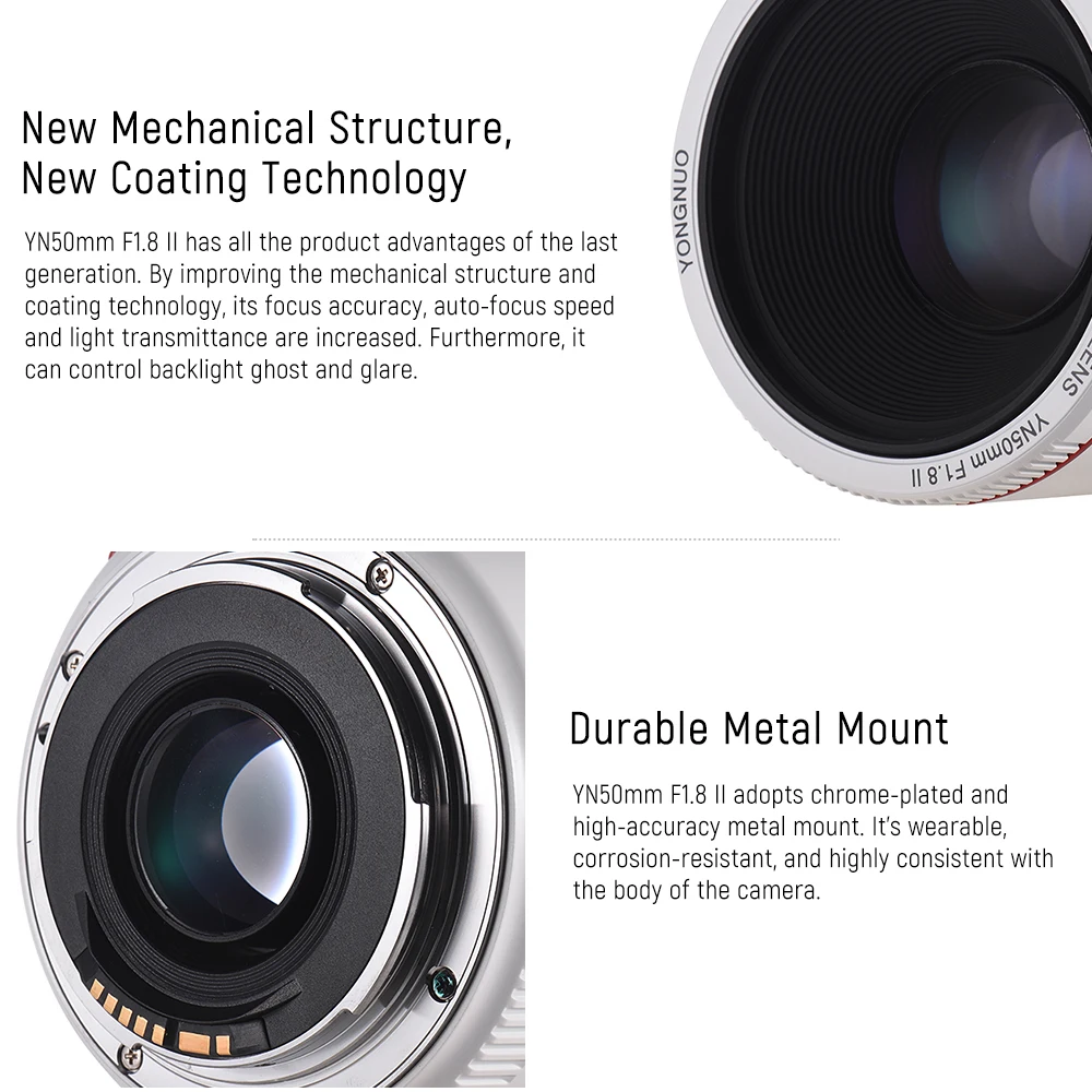 YN50mm F1.8 II имеет все преимущества продукта последнего поколения. Более того, он также оснащен 0,35 М ближайшим расстоянием фокусировки, прочным металлическим креплением и обновлением прошивки без USB.