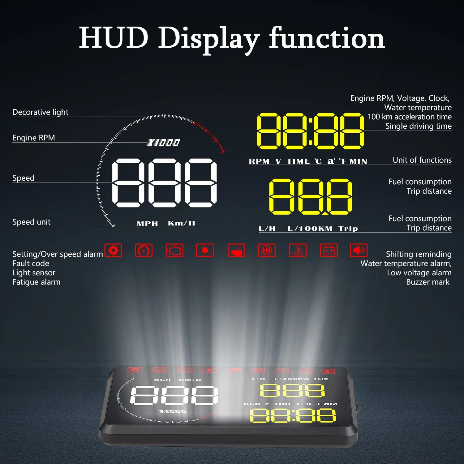 Продукт разработан для безопасного вождения автомобиля. Когда авто на высокой скорости, особенно в ночное время, если водитель опускает голову для просмотра метров или аудио-дисплея, он не будет принимать эффективные меры в то время, когда некоторые аварийные ситуации возникают. В это критическое время, Activesafety HUD отражает очень изысканный уход, проецируя важную информацию о дисплее метров на лобовом стекле при автоматическом движении, например, скорости. Это не только помогает новому водителю с меньшим опытом контролировать скорость, чтобы избежать превышения скорости в некоторой части ограничения скорости дороги, но также это позволяет водителю быстро считывать данные, не трансформируя зрение и держать лучшие часы состояние sobermindedly.