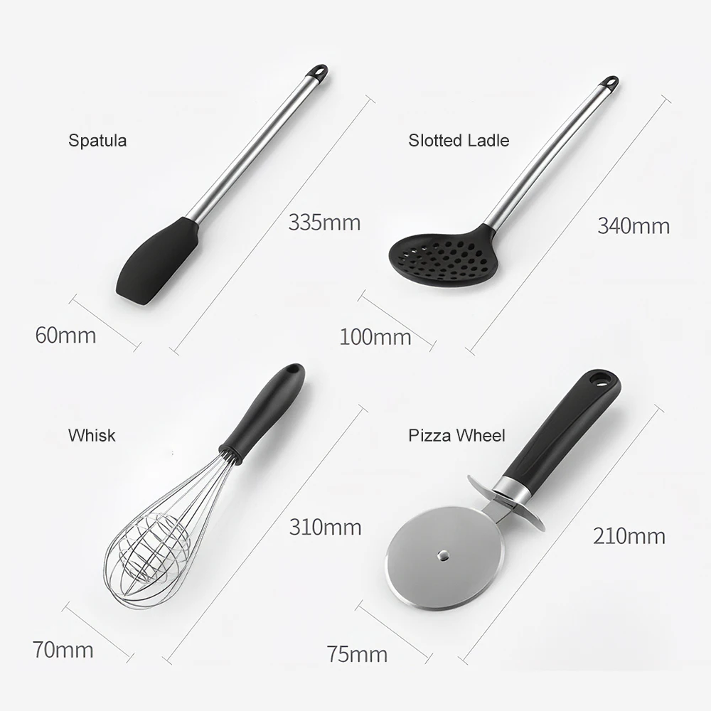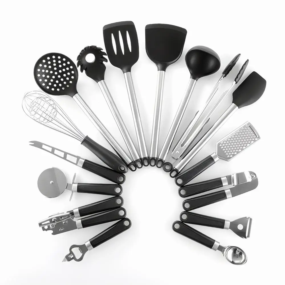 Наш набор кухонной утвари включает в себя: Тонг, шпатель, шлицеваяТернер, твердый Тернер, шлицевой ковш, сервер пасты, суповый ковш, венчик, колесо для пиццы, Овощечистка, совок для мороженого, консервный нож, пресс для чеснока, открывалка для бутылок, нож для сыра, терка для сыра.