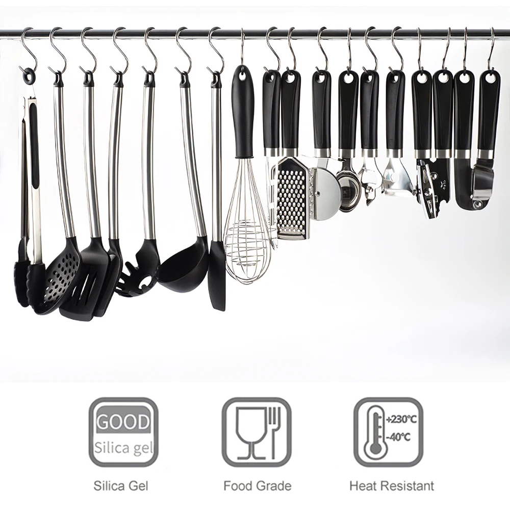 Кольцо-крючок с подарочными крючками в форме S: есть силиконовый крючокКольцо в конце ручки, с подарочными металлическими крючками в форме S, вы можете повесить утварь на кухонную стену, если вам нравится.