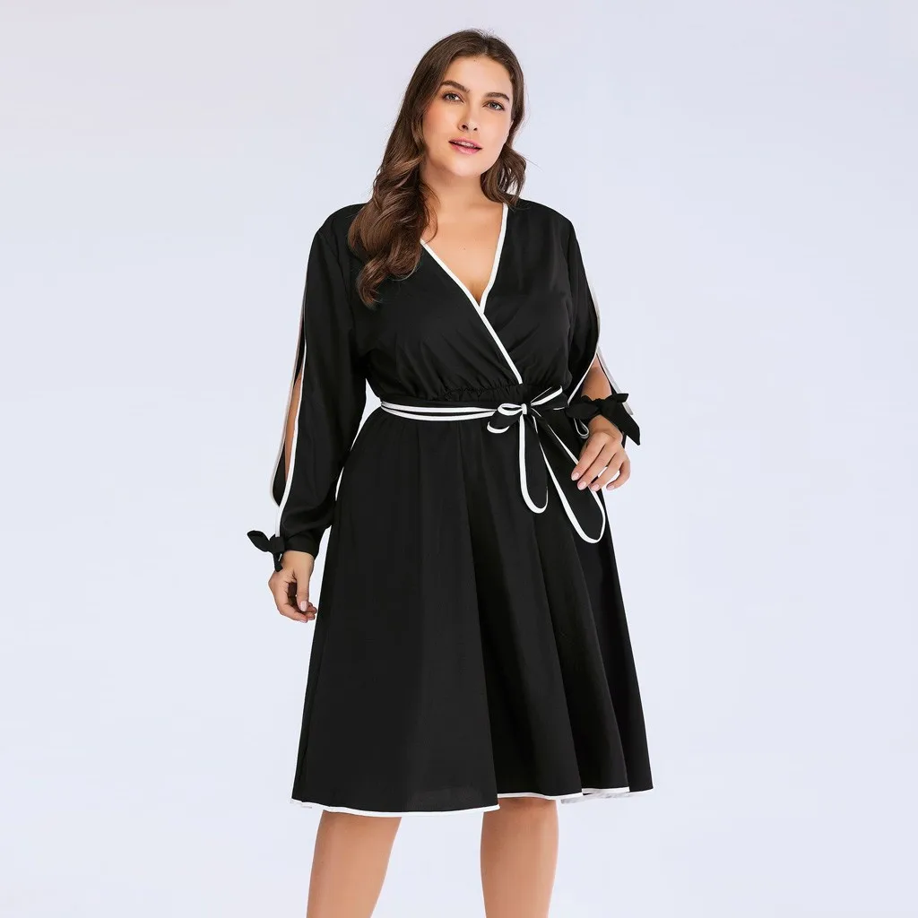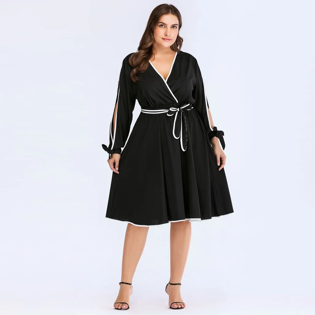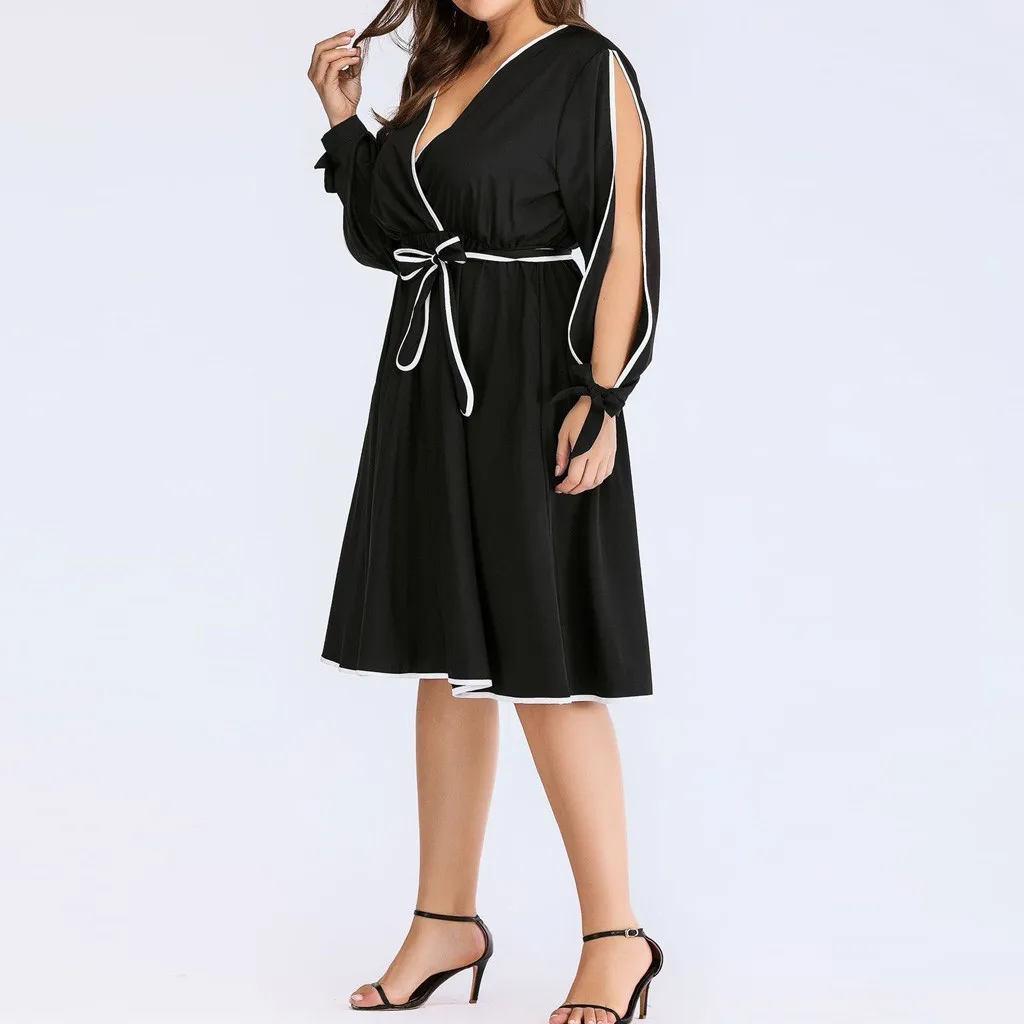 Женское модное Повседневное платье с завязками и бантом, однотонное платье с высокой талией, размера плюс