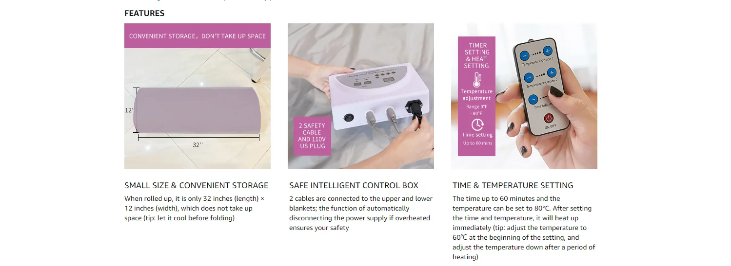 ✿ 2 способа запуска одеяла пароварки: 1. Пульт дистанционного управления + 2 зоны управления, 2. Пульт дистанционного управления. Блок управления 2 зоны автоматически отключает питание, чтобы остановить нагрев, когда температура слишком высока (Примечание: оба способа должны включить кнопку включения на задней панели блока управления)