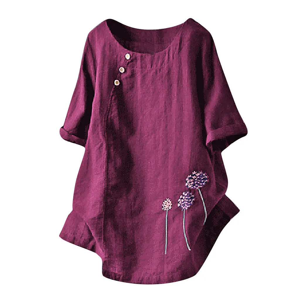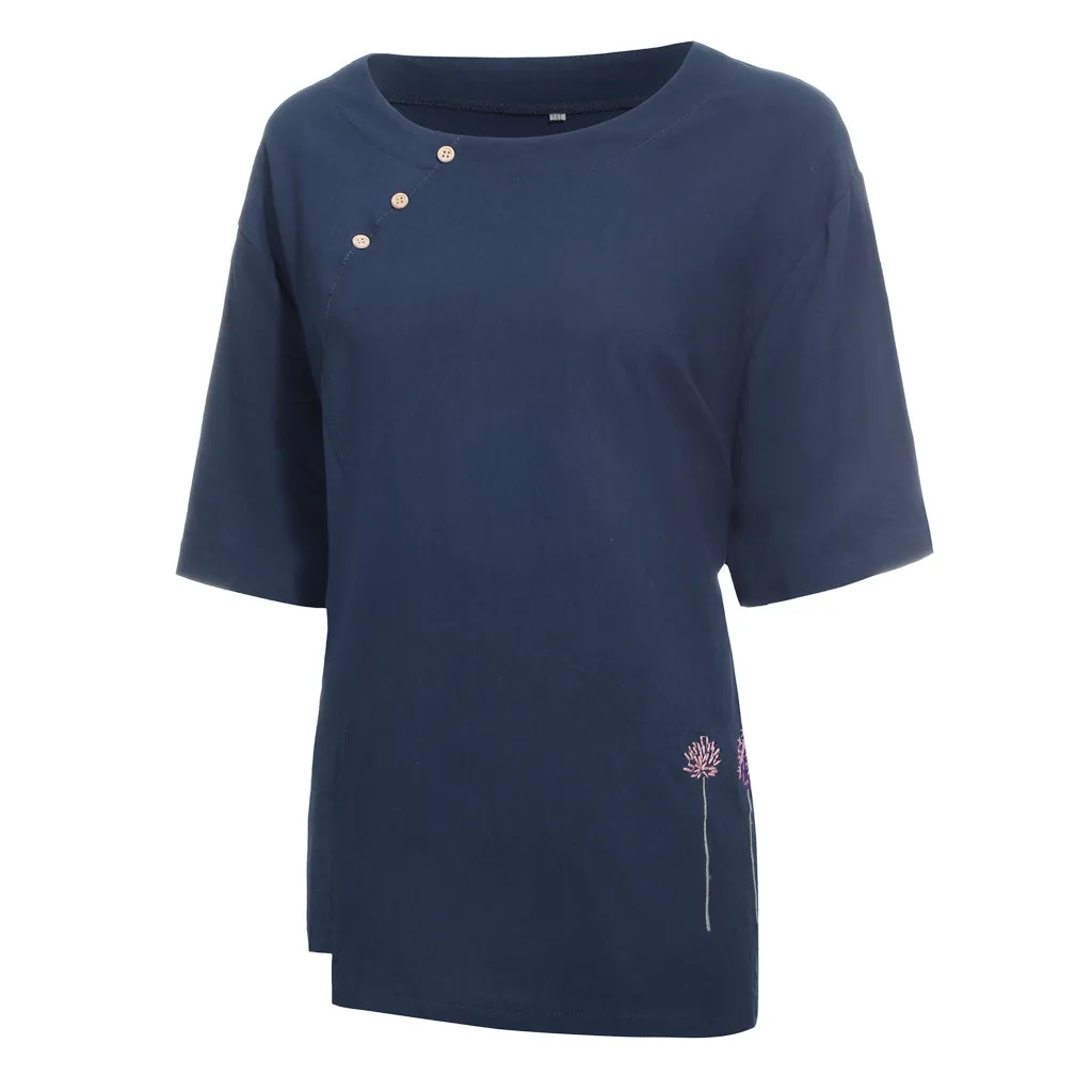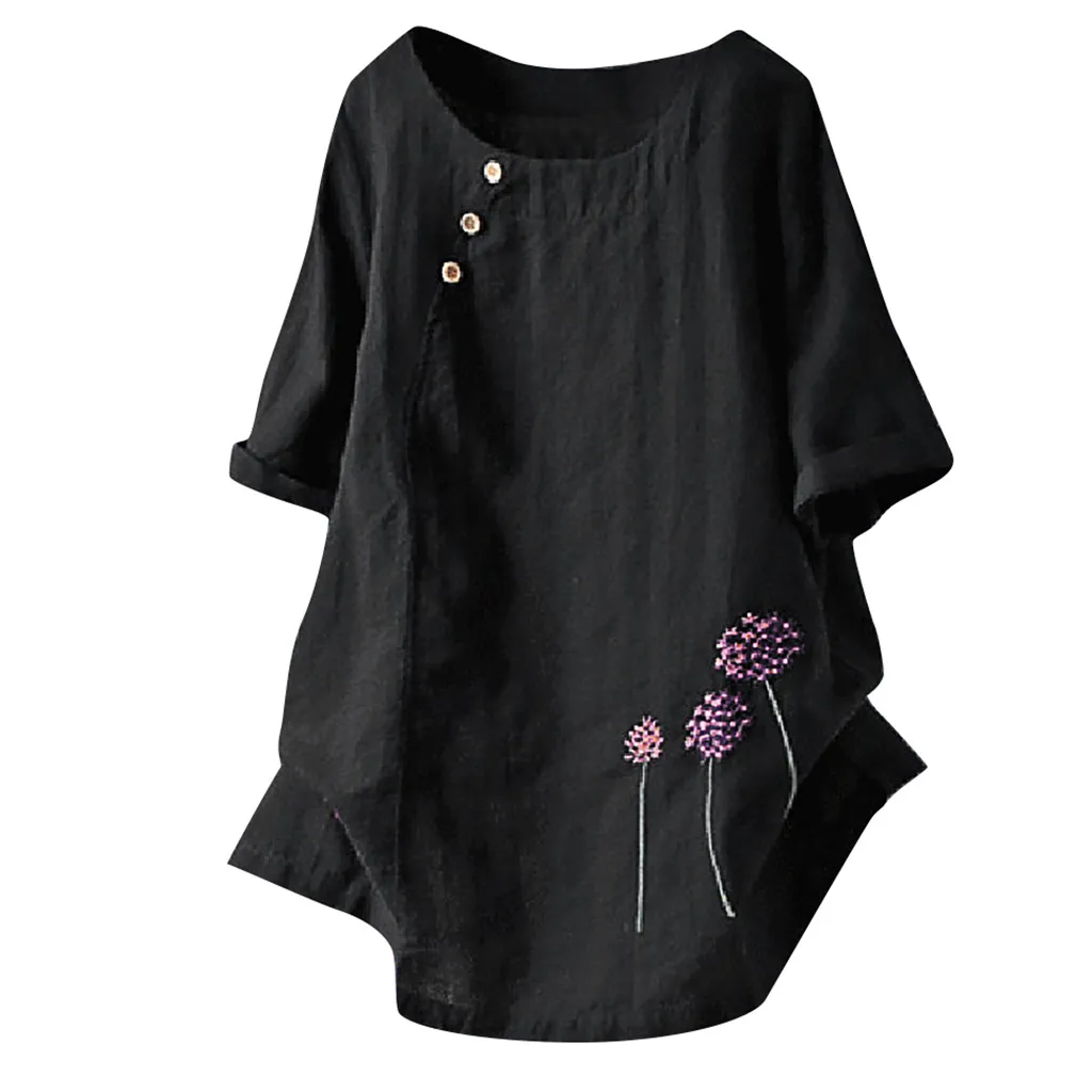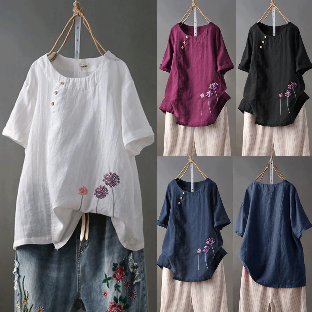Особенности: хлопок и лен, размера плюс, круглый вырез, вышивка, пуговицы,Одуванчик,Повседневная Блузка с короткими рукавами,Повседневная одежда; Стильный и модный дизайн; Летние и весенние повседневные топы.