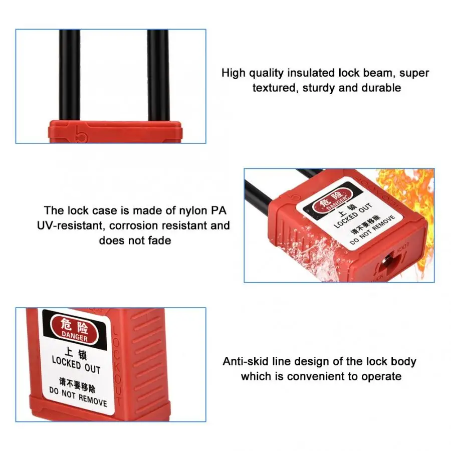 Высокое качество изолированный замок луч, супер текстурированный, прочный и прочный. Чехол с замком изготовлен из нейлона PA, устойчив к УФ-излучению, коррозии и не выцветает. На задней части замка чехол может быть заполнены с именем замка и других важную информацию по мере необходимости. Противоскользящая конструкция корпуса замка, который удобен в эксплуатации. Продуманная конструкция замка и специальный цилиндр замка обеспечивают безопасность навесного замка.