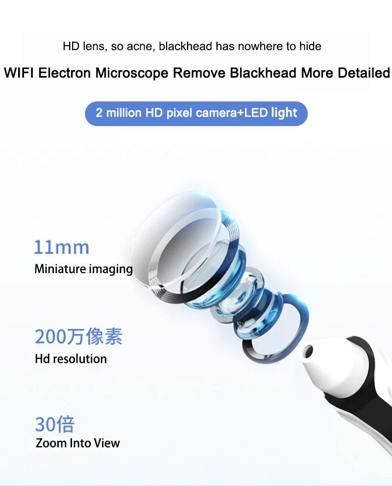 Подключение Wifi к мобильному телефону Загрузите приложение на свой мобильный телефон и Подключитесь к Wi-Fi, увидите процесс, когда машина используется на носу. 3 шт различных размеров мягкие силиконовые вакуумные головки Можно изменить кончики для различных функций, головки из силиконового материала и мягкие на коже, не будут чувствовать боль даже при сильном всасывании. 3 уровня интенсивности вакуума Высокий, средний и низкий уровень для выбора при использовании. Легко моется Головки могут быть отделены для очистки, хлопок может избежать грязной омертвевшей кожи в машине, и он может быть повторно использован. С высокой пропускной способностью 1000 мАч перезаряжаемый аккумулятор Usb провод перезаряжаемый аккумулятор, легко носить с собой, может ухаживать за кожей в любом месте. 500 крат Wifi подключение к мобильному телефону электронный микроскоп