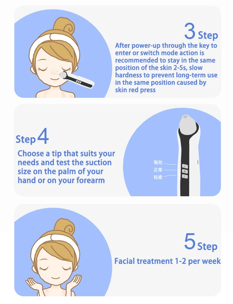 Большое круглое отверстие: мощные всасывающие угри, применяются против черных точек на носу и v-образной поверхности. (Используется с экстрактом черных точек и сжимающей пор водой) Маленькое круглое отверстие: всасывание слабое, его можно использовать для сосания черных точек, подходит для более тонкой кожи. Овальное отверстие: удаление морщин. После сосания кожи быстро отсоедините, а затем снова отсосите. Способствует циркуляции крови, повышает эластичность кожи, эффективно устраняет морщинки.