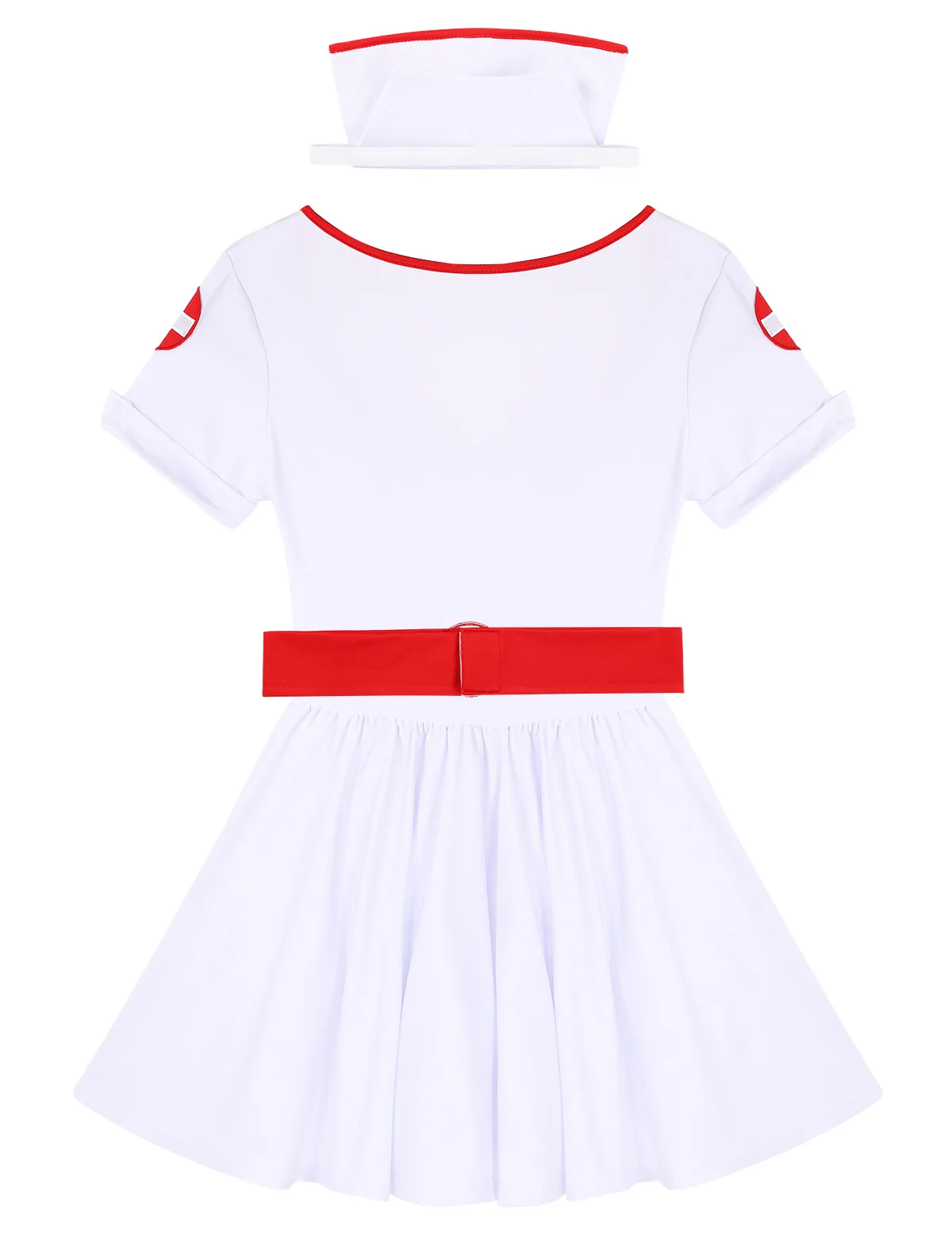Милое декольте и короткий рукав, красный крест логотип патч на плече, с гофрированной сетчатой юбочкой делает платье пышным, выше колена, спереди застежка-молния.