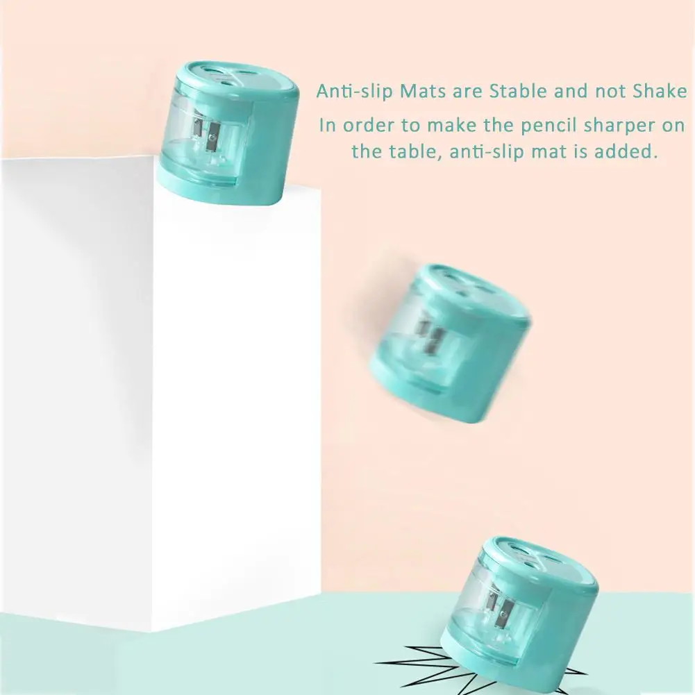 1、The pencil sharpener will start working automatically when you pressing down the pencil. It will stop working when you finish sharpening and release the pencil. So you don't need to worry your kids will hurt when the electric pencil sharpener is working. It's shaving entrance will prevent fingers from being inserted which will protect little kids from being hurt. 2、This 2 holes electric pencil sharpener. You can have more choices to sharpen No. 2 pencils, HB pencils, colored pencils and other standard size pencils. 3、This 2 holes electric pencil sharpener.You can have more choices to sharpen No. 2 pencils, HB pencils, colored pencils and other standard size pencils. 4、The matched device of the newly double turret can be replaced easily, so as to expand its lifespan, and bring you a perfect working experience for double knife cutting function.The powerful pencil sharpener work around 5s cutting,which make your working and studying more efficient and convenient, and save lots of your time in working and life.A necessary gift for your baby's study and your work. 5、The heavy duty electric pencil sharpener can be powered by 4 x AA battery (not included) or USB cord (included) / Note: To make sure it can provide enough strong power to sharpen pencils, we recommend to use USB adapter (not included) to connect the electric pencil sharpener.