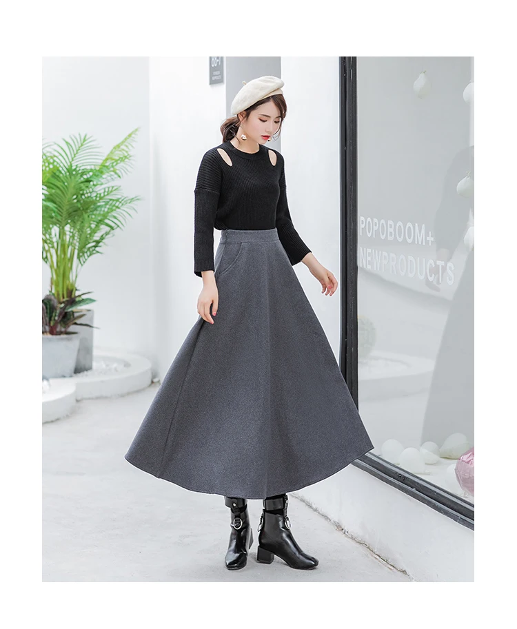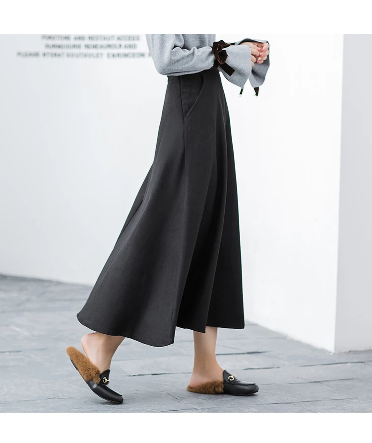 ОписаниеОсенне-зимняя теплая плотная Женская шерстяная юбка, эластичная юбка с высокой талией, а-силуэт, шерстяные юбки, Женская длинная большая свободная юбка DF813 <