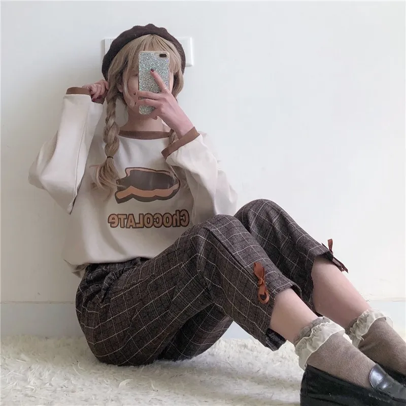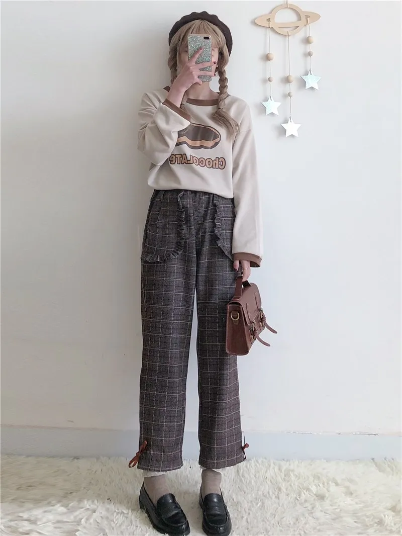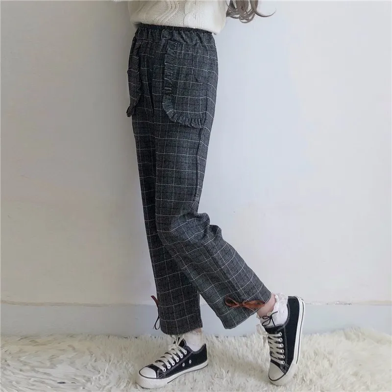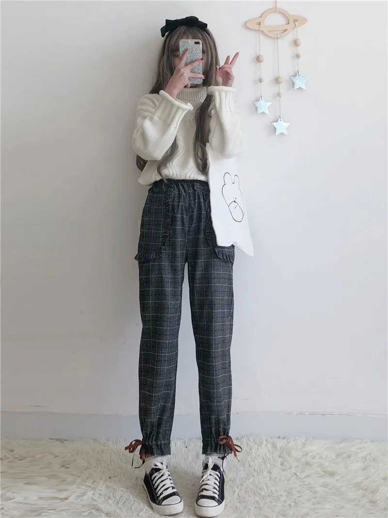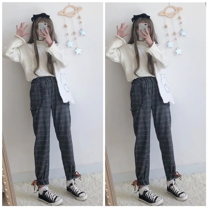 Япония стиль весна осень женские брюки эластичный пояс Мори девушка плед гарем лодыжки длина брюки DC702 <