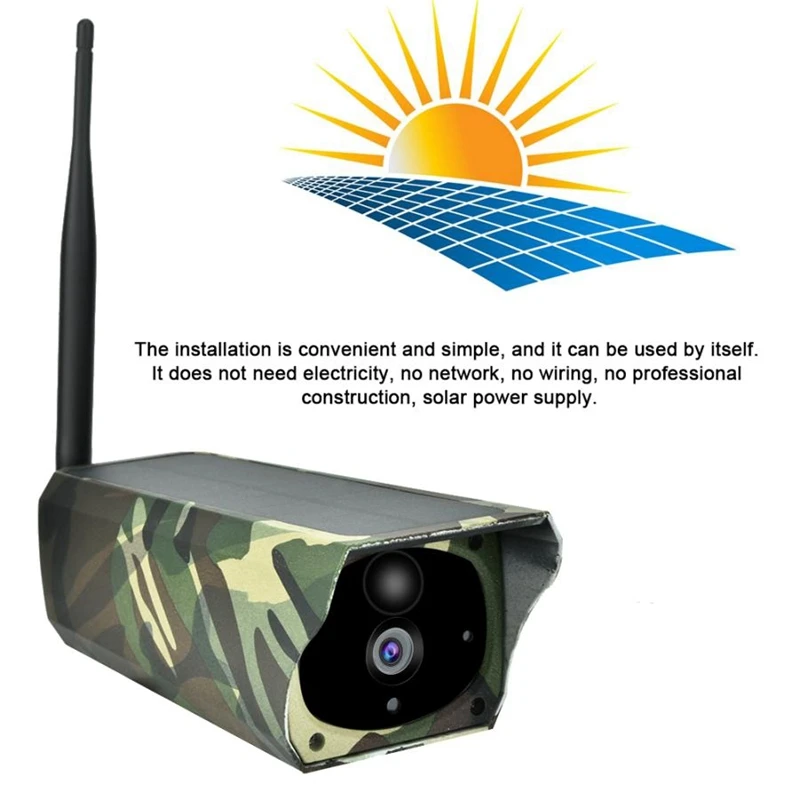 Установка удобна, не требует электричества, нет сети, Нет проводки, нет профессиональной конструкции, Солнечный источник питания. 15 метров инфракрасного ночного видения, 10 метров, чтобы увидеть характеристики животных, 15 метров, чтобы увидеть контур животных.