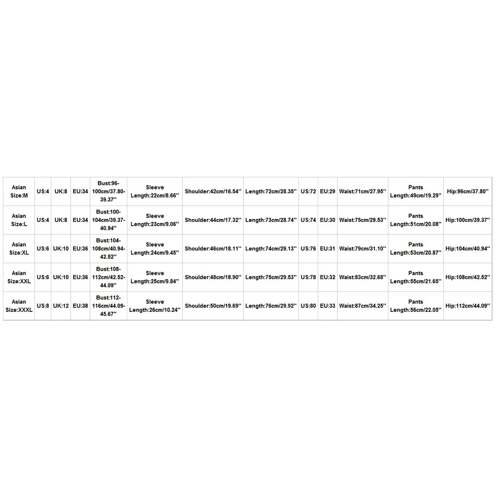 Азиатский размер: M US:4 UK:8 EU:34 Бюст: 96-100 см/37,80-39,37 ''Длина рукава: 22 см/8,66'' плечо: 42 см/16,54 дюйма Длина: 72 см/28,35 дюйма США: 72 ЕС: 29 обхват талии: 71 см/27,95 дюйма Длина брюк: 49 см/19,29 дюйма обхват бедер: 96 см/37,80 дюйма Азиатский размер: L US:4 UK:8 EU:34 Бюст: 100-104 см/39,37-40,94 ''Длина рукава: 23 см/9,06'' плечо: 44 см/17,32 дюйма длина: 73 см/28,74 дюйма США: 74 ЕС: 30 обхват талии: 75 см/29,53 дюйма Длина брюк: 51 см/20,08 дюйма обхват бедер: 100 см/39,37 дюйма Азиатский Размер: XL US:6 UK:10 EU:36 Бюст: 104-108 см/40,94-42,52 ''Длина рукава: 24 см/9,45'' плечо: 46 см/18,11 дюйма Длина: 74 см/29,13 дюйма США: 76 Европейский: 31 обхват талии: 79 см/31,10 дюйма Длина брюк: 53 см/20,87 дюйма обхват бедер: 104 см/40,94 дюйма Азиатский Размер: XXL US:6 UK:10 EU:36 Бюст: 108-112 см/42,52-44,09 ''Длина рукава: 25 см/9,84'' плечо: 48 см/18,90 дюйма Длина: 75 см/29,53 дюйма США: 78 европейский размер: 32 обхват талии: 83 см/32,68 дюйма Длина брюк: 55 см/21,65 дюйма обхват бедер: 108 см/42,52 дюйма Азиатский размер: 3XL US:8 UK:12 EU:38 Бюст: 112-116 см/44,09-45,67 ''Длина рукава: 26 см/10,24'' плечо: 50 см/19,69 дюйма Длина: 76 см/29,92 дюйма США: 80 ЕС: 33 талия: 87 см/34,25 дюйма Длина брюк: 56 см/22,05 дюйма обхват бедер: 112 см/44,09 дюйма