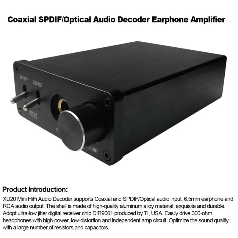 XU20 Мини HiFi аудио декодер поддерживает коаксиальный и SPDIF/оптический аудио вход, 6,35 мм наушники и RCA аудио выход.
