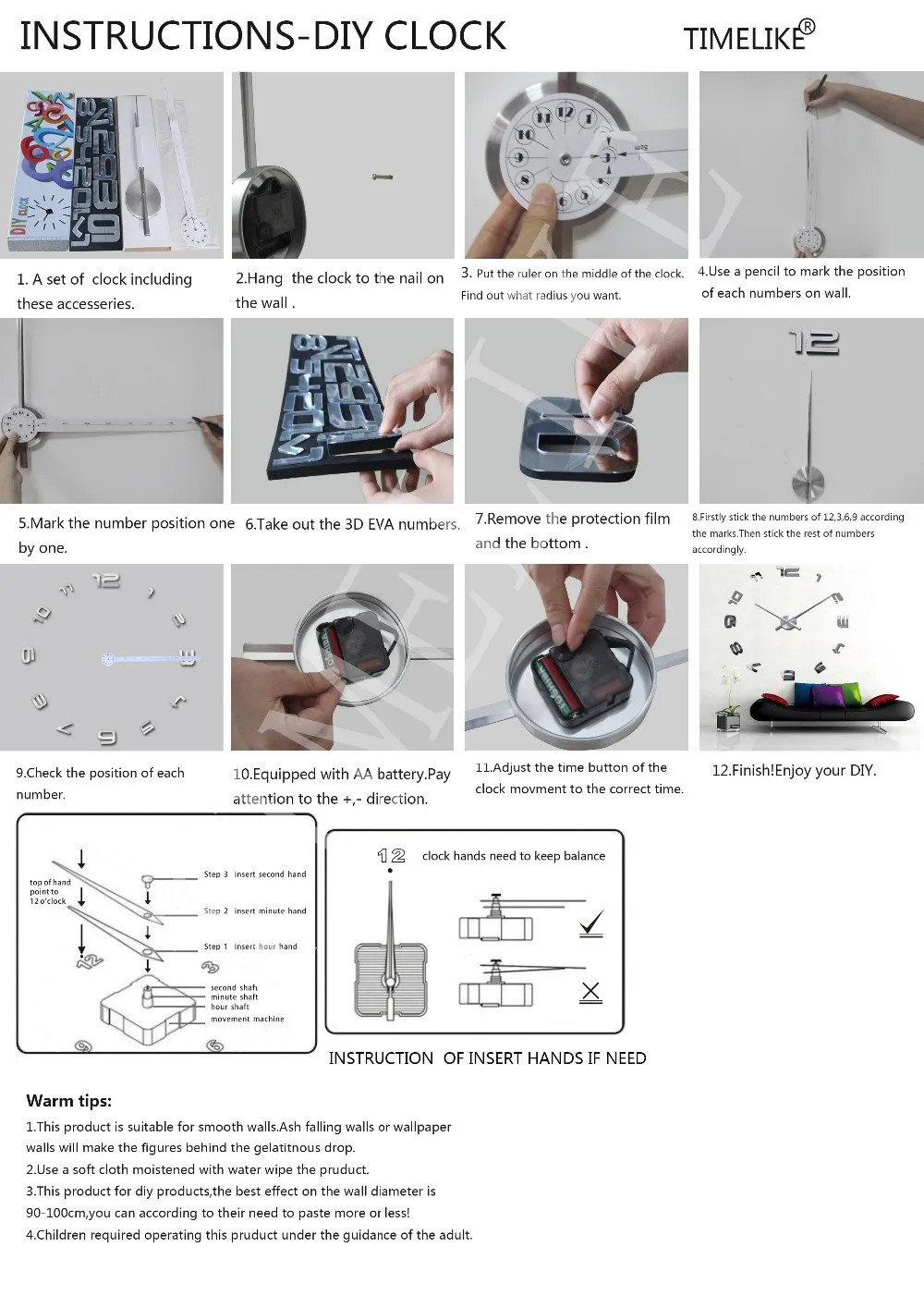 1. Наклейки сделаны из материала EVA пены и зеркального материала, который не токсичен и не выцветает, может прослужить около 3-5 лет. 2. Наклейки могут быть съемными, с клеем на задней стороне, легко наклеить на стену или любую другую чистую и гладкую поверхность; например, дверь, шкаф и так далее; 3. Зеркало с клеем, прежде чем наклеить наклейку на стену, необходимо сначала наклеить зеркало на поверхность наклейки; 4. Diy дизайн, размер макета часов измеряется руками, может быть просто меньше или больше размер. Материал наклейки: пена Эва (этиленвинилацетат) Материал часов: металл Часовая стрелка: 31,5 см/23,5 см Минутная стрелка: 39 см/31,5 см Часовой механизм: 12 см/10 см Минимальное достижения: 63 см x 63 см/50 см x 50 см Окончательный размер украшения часов определяется тем, как вы хотите украсить ваши стены. Различная форма 37 дюймов и 47 дюймов-Это часовая головка и часовая игла, номера часов одинаковые.