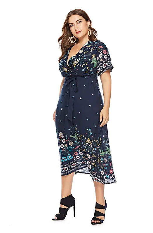 Женское летнее платье размера плюс 2020, женское длинное платье с v-образным вырезом и коротким рукавом, винтажная туника в стиле бохо, пляжные платья AE48