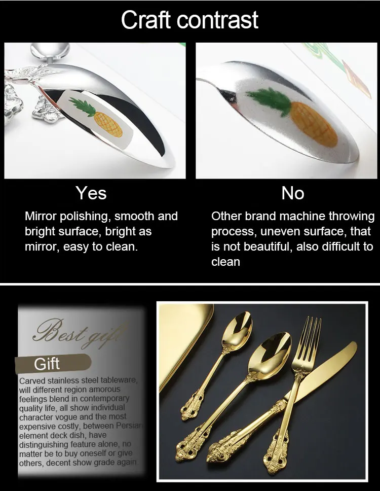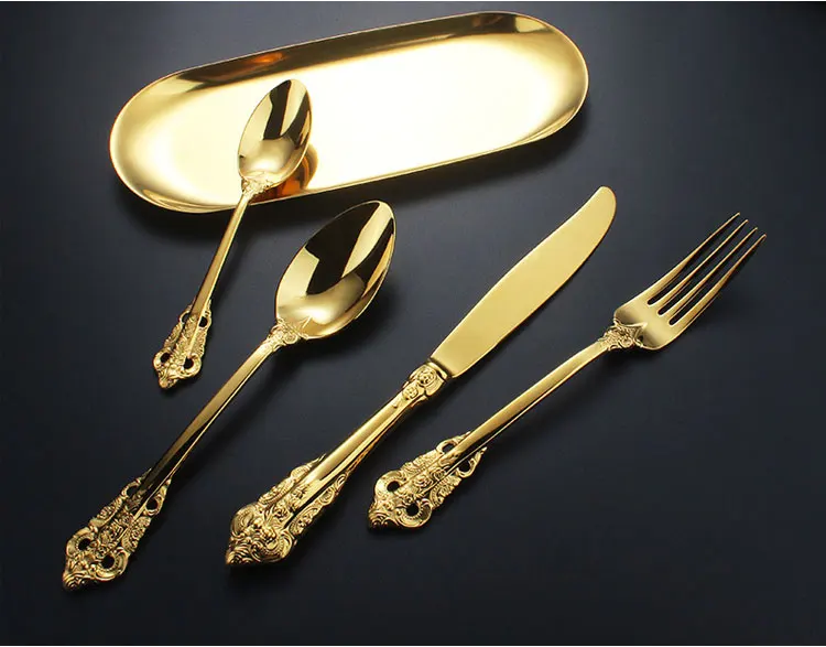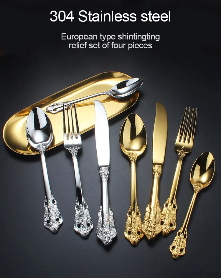 Дизайн: Королевский античный Европейский стиль Процесс: тиснение Продукты включают в себя: 1 * Основной нож 1 * Основной ложка 1 * вилка для основного блюда 1 * Десерт/чайная ложка Материал: нержавеющая сталь 304