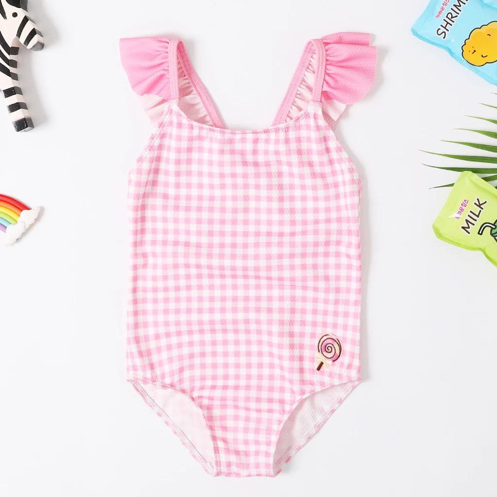 Новый купальник для маленьких девочек, Цельный купальник, классический стиль, боди с геометрическим рисунком, купальник для девочек, купальный костюм с вышивкой мороженого