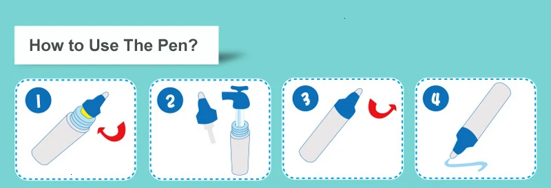 1. Перед использованием, пожалуйста, положите головку ручки для рисования в воду, чтобы замочить в течение 2-3 часов. Убедитесь, что ручка работает плавно.