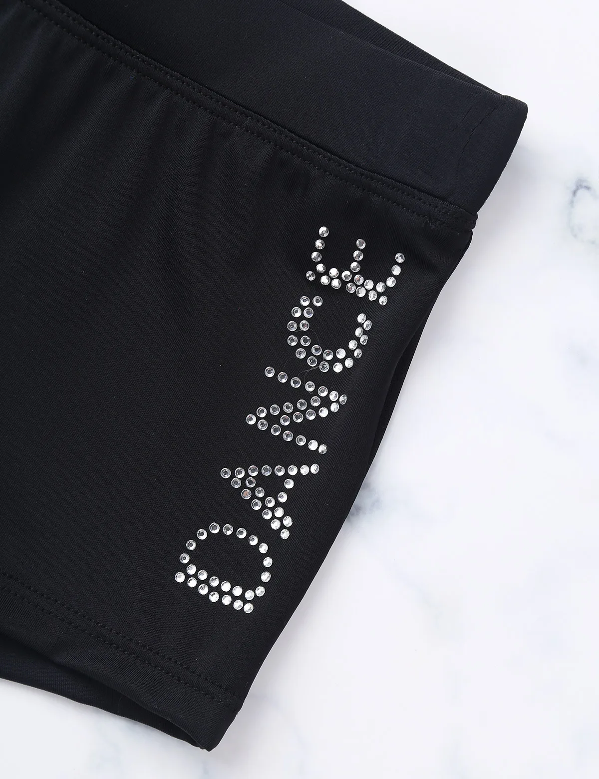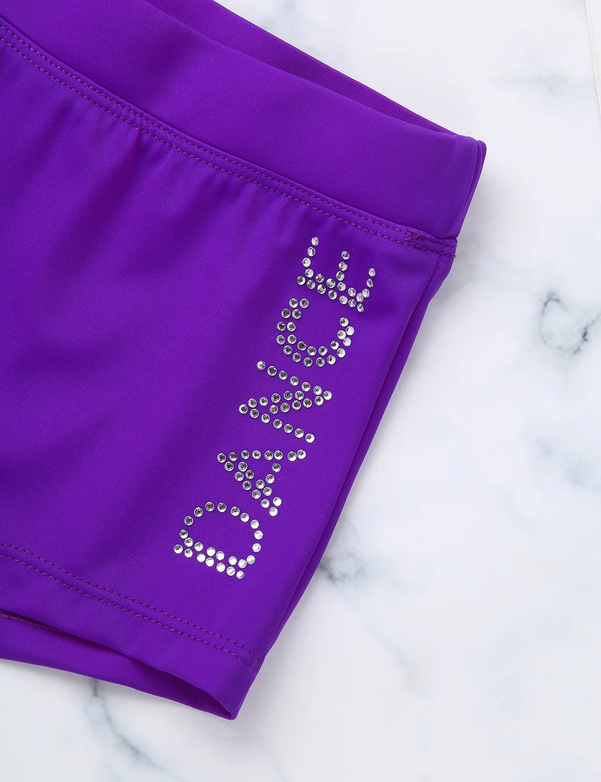 Широкий эластичный пояс и блестящие стразы с надписью «DANCE» с одной стороны.