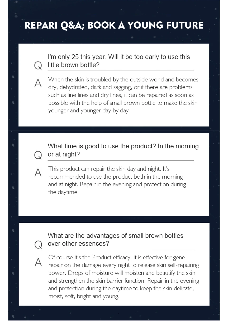 В этом году мне всего 25. Будет ли еще рановато использовать эту маленькую коричневую бутылочку? Когда кожа переживает внешний мир и становится сухой, обезвоженной, темной и обвисшей, или если есть проблемы, такие как тонкие линии и сухие линии, его можно отремонтировать как можно скорее с помощью маленькой коричневой бутылки, чтобы сделать кожу более молодой и молодой день за днем В какое время хорошо использовать продукт? По утрам или ночью? Этот продукт может восстанавливать кожу днем и ночью. Рекомендуется использовать продукт как по утрам, так и по ночам. Ремонт в вечернее время и защита в дневное время. Каковы преимущества маленьких коричневых бутылок по сравнению с другими эссенциями? Конечно, это эффективность продукта. Эффективно для восстановления генов на повреждении каждую ночь, чтобы высвободить кожу самовосстанавливающей силы. Капли влаги увлажнит и украсит кожу и усилит кожную барьерную функцию. Ремонт в вечернее время и защита в дневное время, чтобы сохранить кожу нежной, влажной, мягкой, яркой и молодой.