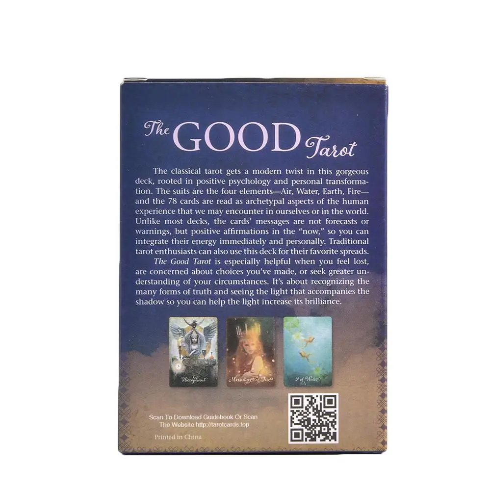 Основанное на системе гадания, которая датируется веками, хорошее Таро имеет экстрасенсорическую архитектура, которая более простая и современная, укоренились в современной позитивной философии и были нацелены на воплощение самого высокого блага для всех. 78 карт в колоде читаются как архетипические стороны человеческого опыта, с которым мы можем иметь дело внутри себя, с другими или в мире. Костюмы в хорошем Таро-это четыре элемента, с воздухом, стоящим под традиционные мечи, водой, заменяющей чашки, Земля для Пентаклей, и для палочек, огонь. Ключевое отличие от традиционных колод заключается в том, что сообщения карт написаны как положительные аффирмации в настоящее время, а не как предсказания, инструкции или предупреждения. Те, кто использует карты предложенным способом, могут интегрировать свою энергию немедленно и лично.