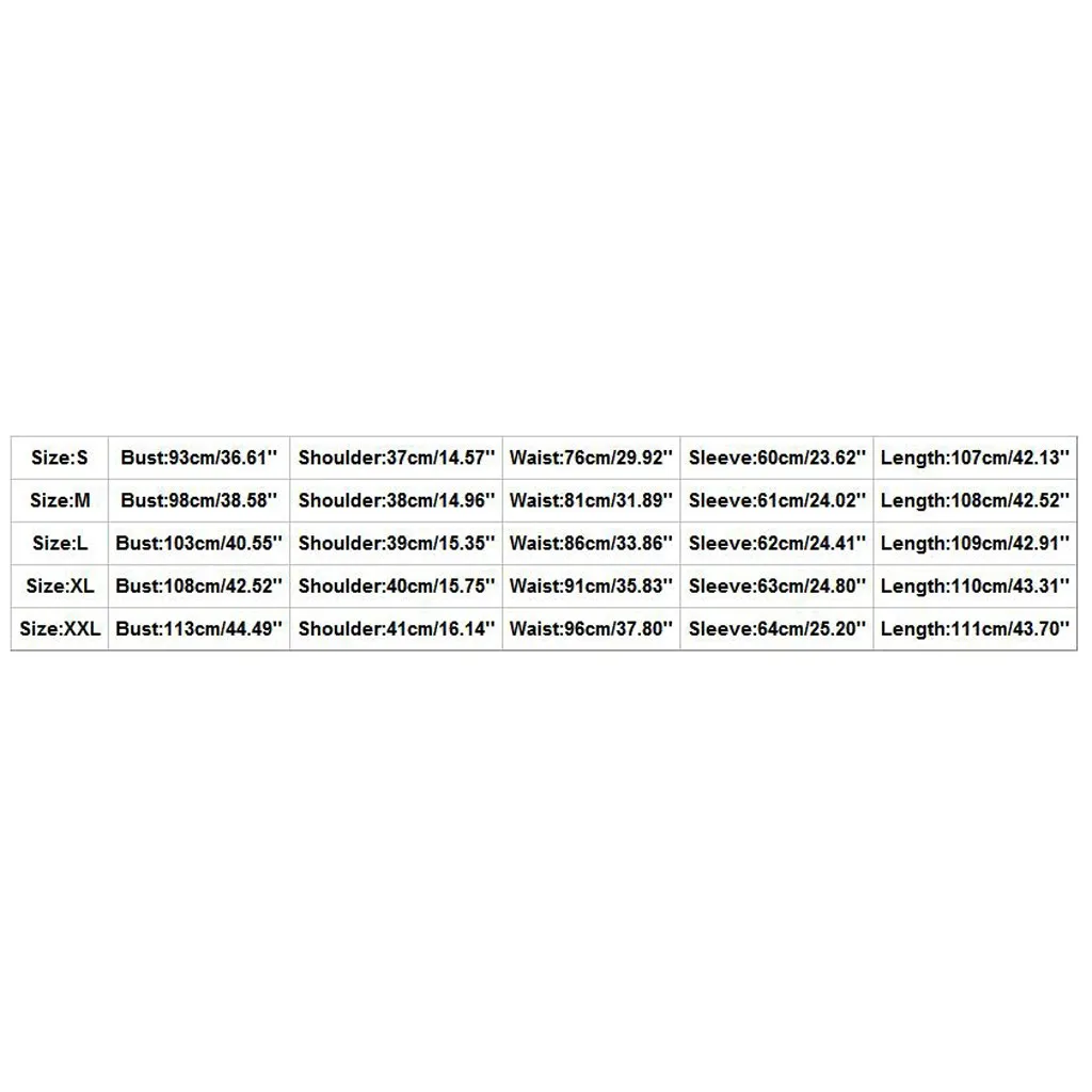 Размер: SОбхват груди: 93 см/36,61 дюймаШирина плеч: 37 см/14,57 дюймаТалия: 76 см/29,92 дюймаРукав: 60 см/23,62 дюймаДлина: 107 см/42,13 дюймаРазмер: MОбхват груди: 98 см/38,58 дюймаШирина плеч: 38 см/14,96 дюймаТалия: 81 см/31,89 дюймаРукав: 61 см/24,02 дюймаДлина: 108 см/42,52''Размер: LОбхват груди: 103 см/40,55 дюймаПлечо: 39 см/15,35 дюймаТалия: 86 см/33,86 дюймаРукав: 62 см/24,41 дюймаДлина: 109 см/42,91 дюймаРазмер: XLОбхват груди: 108 см/42,52 дюймаПлечо: 40 см/15,75 дюймаТалия: 91 см/35,83 дюймаРукав: 63 см/24,80 дюймаДлина: 110 см/43,31''Размер: XXLОбхват груди: 113 см/44,49 дюймаШирина плеч: 41 см/16,14 дюймаТалия: 96 см/37,80 дюймаРукав: 64 см/25,20 дюймаДлина: 111 см/43,70''